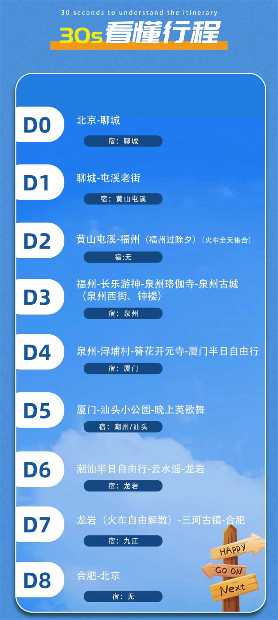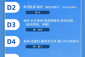 D0/2.14|北京-聊城(宿聊城)D1/2.15|聊城-屯溪老街(宿黄山屯溪)D2/2.16|黄山屯溪-福州(福州过除夕)(火车全天集合)D3/2.17|福州-长乐游神-泉州珞伽寺-泉州古城(泉州西街、钟楼)(宿泉州)D4/2.18|泉州-浔埔村-簪花开元寺-厦门半日自由行(宿厦门)D5/2.19|厦门-汕头小公园-晚上英歌舞(宿潮州/汕头)D6/2.20|潮汕半日自由行-云水谣-龙岩(宿龙岩)D7/2.21|龙岩(火车自由解散)-三河古镇-合肥(宿)