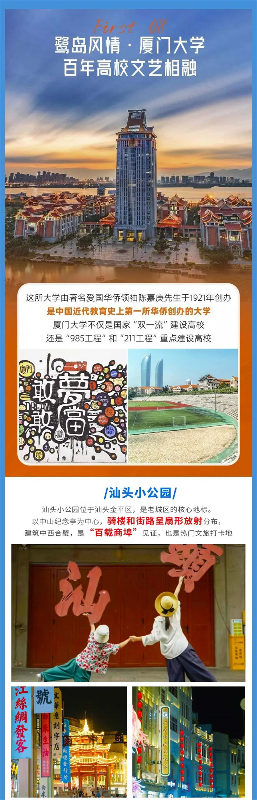 适时集合前往厦门,大家根据自己爱好自由行。推荐先前往南普陀寺,感受闽南佛国氛围,再到厦门大学外观赏,沿芙蓉隧道口看看创意涂鸦,最后步行至顶澳仔猫街,欣赏可爱的猫元素,品尝漳州四果汤等小吃,这条路线文化气息浓厚,且步行即可串联。或根据您的爱好自行攻略。
