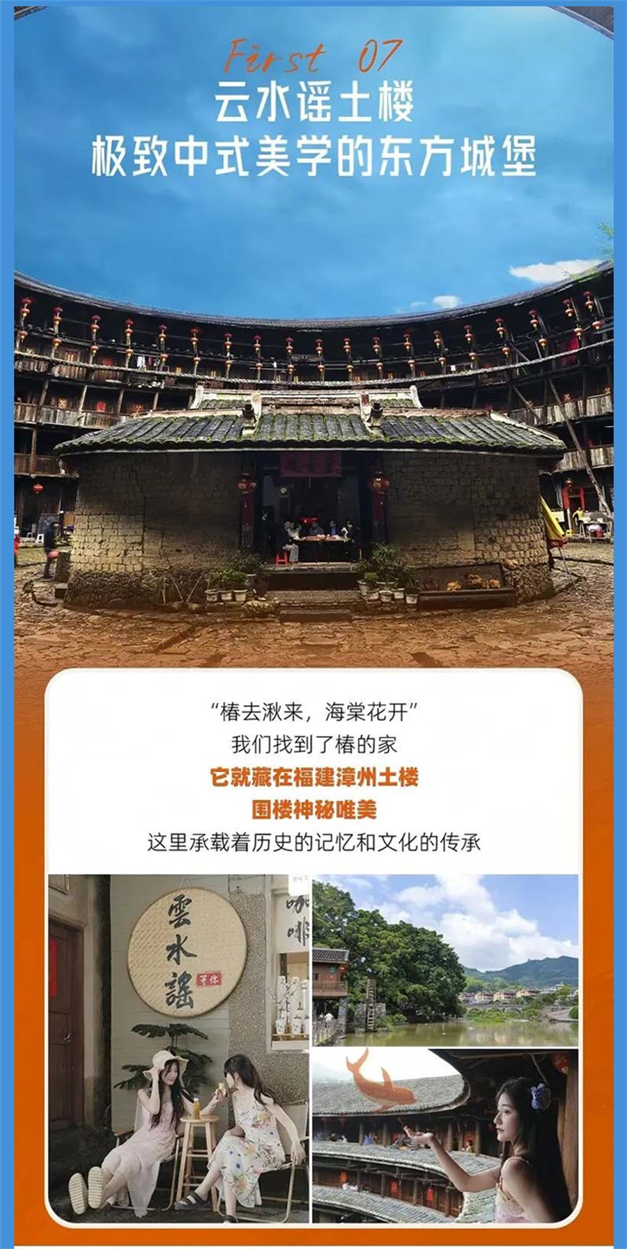 适时集合前往云水谣。云水谣古镇位于福建漳州南靖县,是世界文化遗产福建土楼的重要组成部分。这里有和贵楼、怀远楼等 53 座土楼,还有千年古道、百年榕树群等景观。推荐路线:和贵楼→云水谣古道→古榕树群→大水车→怀远楼,全程步行,节奏轻松,可深度感受客家风情与土楼魅力。