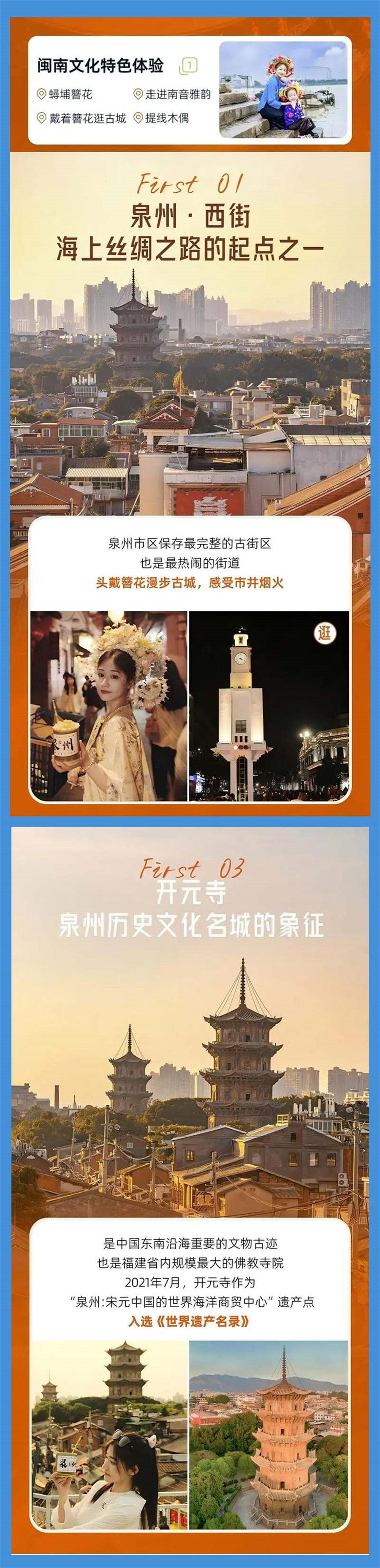 之后,我们前往【西街】网红点打卡,晚餐在此寻觅美食,泉州的“土著”样子,莫过于西街的一切,围绕【钟楼】寻觅小吃美食,感受时光的印记。适时集合前往泉州入住。