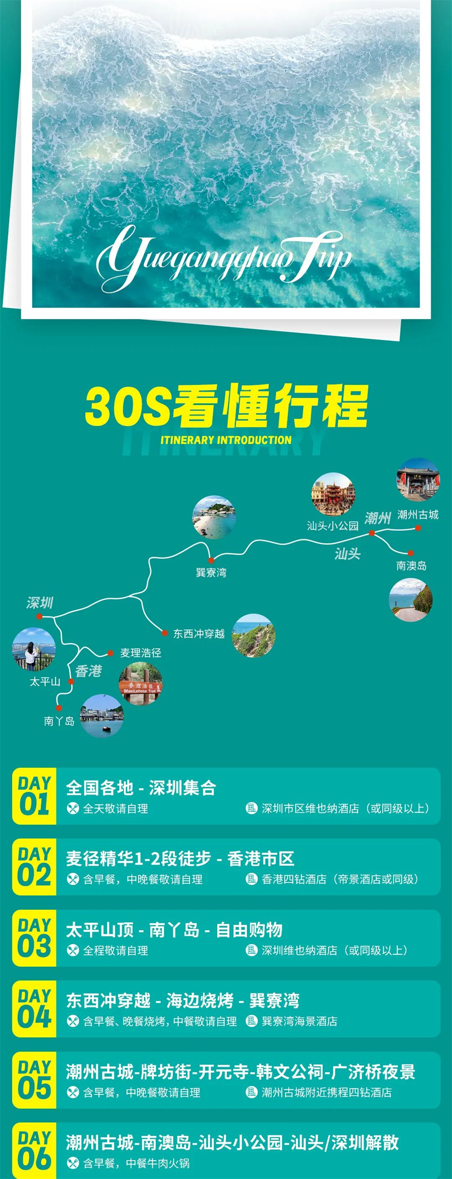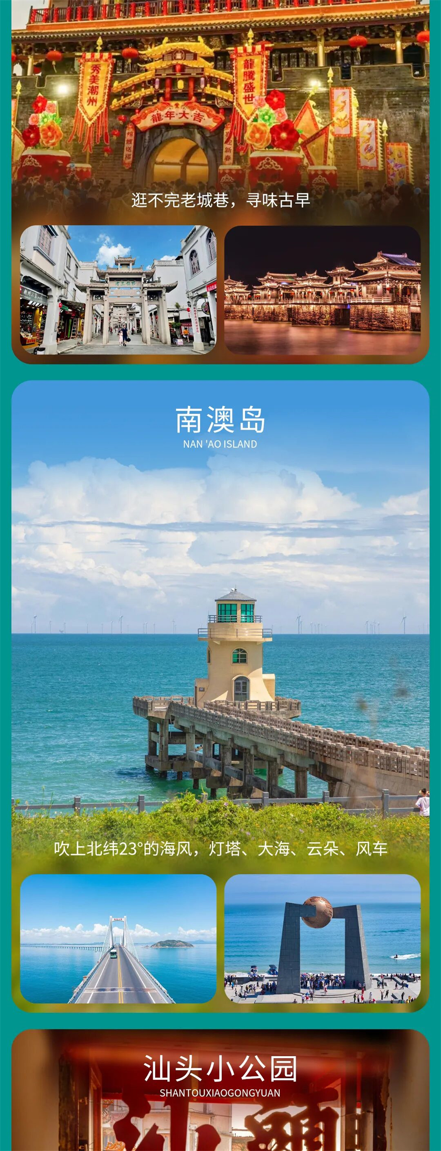 D6:潮州古城 - 南澳岛 - 汕头小公园 - 解散▷ 用餐:含早餐,中晚餐敬请自理▷ 住宿:回到温馨的家早起洗漱,在酒店享用早餐,随后出发南澳岛。注意:如遇国庆,春节假期由于南澳岛堵车严重,第六日行程将改为汕头小公园,看英歌舞。乘车穿越跨海大桥,环岛路蜿蜒山海之间,左手是苍翠的风车阵,右边是蓝天白云的海岸线。这个宝藏海岛等你来打卡!分分钟拍出大片。沿着海滨路向西,长山尾灯塔的红白配色与跨海大桥同框出镜,仿佛闯入了漫画世界。打卡“北回归线标志塔 ”地理标志景点。再去青澳湾!这里拥有月牙形沙滩,细软的白沙轻吻脚尖。舌尖上的冒险则要从一顿海鲜大餐开始!嫩滑的紫菜炒饭、肥美的生蚝、弹牙的鱿鱼,搭配当地特色金薯甜汤,鲜掉眉毛。这就是南澳岛,一半是山海奇观,一半是人间烟火。回程沿途车观【彩虹牧场】成片的彩虹海在这里,触手可及的温柔与诗意,浪漫而又治愈。下午带大家一秒穿越回民间时期,欢迎来到汕头小公园。这里的时间仿佛被定格在1930年代,随手一拍就是《花样年华》的剧照。在扇形放射的骑楼街巷、寻味民国烟火,老字号里的舌尖记忆。活动解散前安排大家来一顿正宗的潮汕牛肉火锅,新鲜黄牛肉在锅里涮上七八下,搭配灵魂沙茶酱,一口下去,满满的幸福感。吃饱喝足后,我们的活动正式结束啦。我们贴心的给大家安排了汕头、深圳两地散团,意犹未尽的小伙伴可以继续在汕头游玩,如想跟车回深圳解散的,也可坐车回到深圳解散。常感谢大家的一路相伴。温馨提示:1:第六日如果跟大巴车回到深圳的客人,建议订次日的大交通回程。当天需要在汕头返程的客人,建议订在20点以后航班或动车,请自行安排时间前往回程。2:活动行程中如遇堵车、天气等原因,领队会根据实际情况对行程做出相应调整,希望队友们理解。