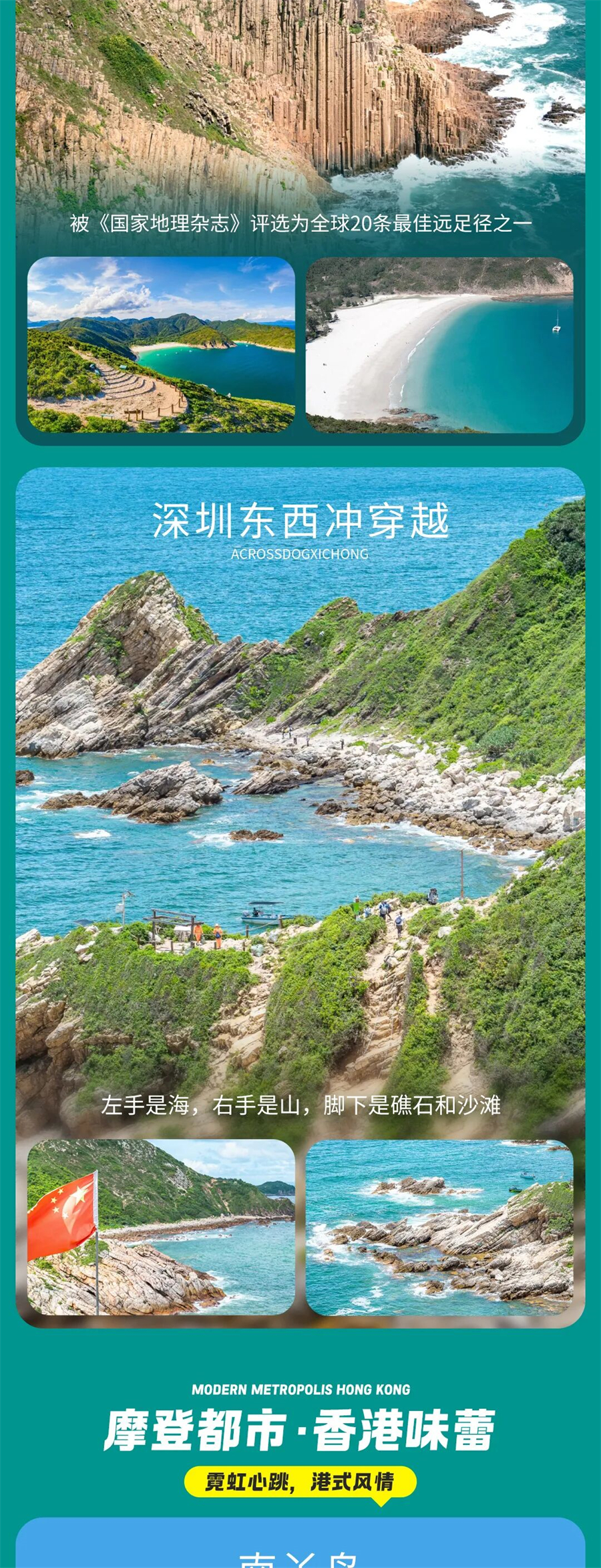 D2:麦理浩径1-2段徒步 - 香港市区▷ 用餐:含早餐,中晚餐敬请自理▷ 住宿:香港四钻酒店(帝景酒店或同级)▷路程:徒步约14公里 累计爬升700米(中途自带路餐)早餐后出发,前往深圳口岸过关香港,集体往起点万宜水库东坝下车赏景摄影【联合国地质公园】。拥有世界一流的酸性火山岩柱,展现了一段数亿年间的古生时期地质历史。中午打卡麦径必去的景点,灵魂封面东坝。浏览地质公园园碑、六角岩柱、破边洲、标尖角,沿麦理浩径开始徒步经过【浪茄湾】海浪侵蚀力量较弱,拥有可以媲美斐济群岛的海滩绵绵细沙,海水清澈,徒步到达西湾亭。下午途径咸田湾,面前是一派宁静的海滩自然风光与别具风情的渔村小景,更可远眺蚺蛇尖。米白色沙滩与玻璃海扑面而来,有山路也有沙滩路,后基本以山间小道为主,全程会经过西湾、咸田湾两个海湾。行程全部走完麦理浩径风景最精华的1-2段。然后乘车出发,返回市区酒店休息洗漱。灯火璀璨的香港千万不要错过,我们入住市区酒店后自由活动,品尝各种当地美食,热门夜景地标等...推荐晚上打卡地,以下供做参考。①:维多利亚港,面对享誉世界的天际线,摩天高楼林立,青山环抱,还有频繁穿梭其中的船只等等,在这里随手一拍都是电影大片;这里还有地道的港式点心、海鲜等美食,让你的味蕾得到满足。②:庙街夜市,无数的港片、无数的经典、无数的情怀,都浓缩在这条并不是很长的庙街里。热闹的夜市摊档、此起彼伏的叫卖声、全港仅存的街头歌档。要体验最地道、有烟火气的香港夜生活,一定要来庙街。③:兰桂坊,酒杯盛满都市的不眠夜,发展到至今包罗万象,夜夜笙歌舞不停,显然兰桂坊已经成为知名地标。