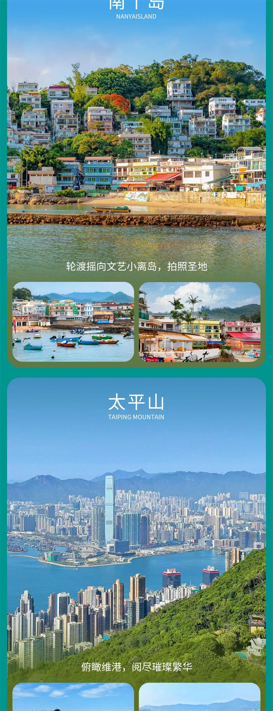 D3:太平山顶 - 南丫岛 - 自由购物▷ 用餐:全程敬请自理▷ 住宿:深圳维也纳酒店(或同级以上)起床洗漱,随后乘车前往香港太平山顶,是中国香港的游览胜地之一。太平山是中国香港最高的山,其海拔达552米,登上太平山顶,居高临下,可俯瞰整个城市。山顶上有好吃好玩的打卡點,包括卢吉道观景平台、杜莎夫人蜡像馆、凌霄阁摩天台等,每个都是值得一游的好去处。随后坐车前往中环码头,感受最有香港味的城区,去长南丫岛)感受文艺小岛风情,一起拿起相机,美食、美照两者都不缺。下午自由在香港CityWalk,也可到市区购物与寻找传说中的美食。晚上统一回到深圳市区入住酒店休息。