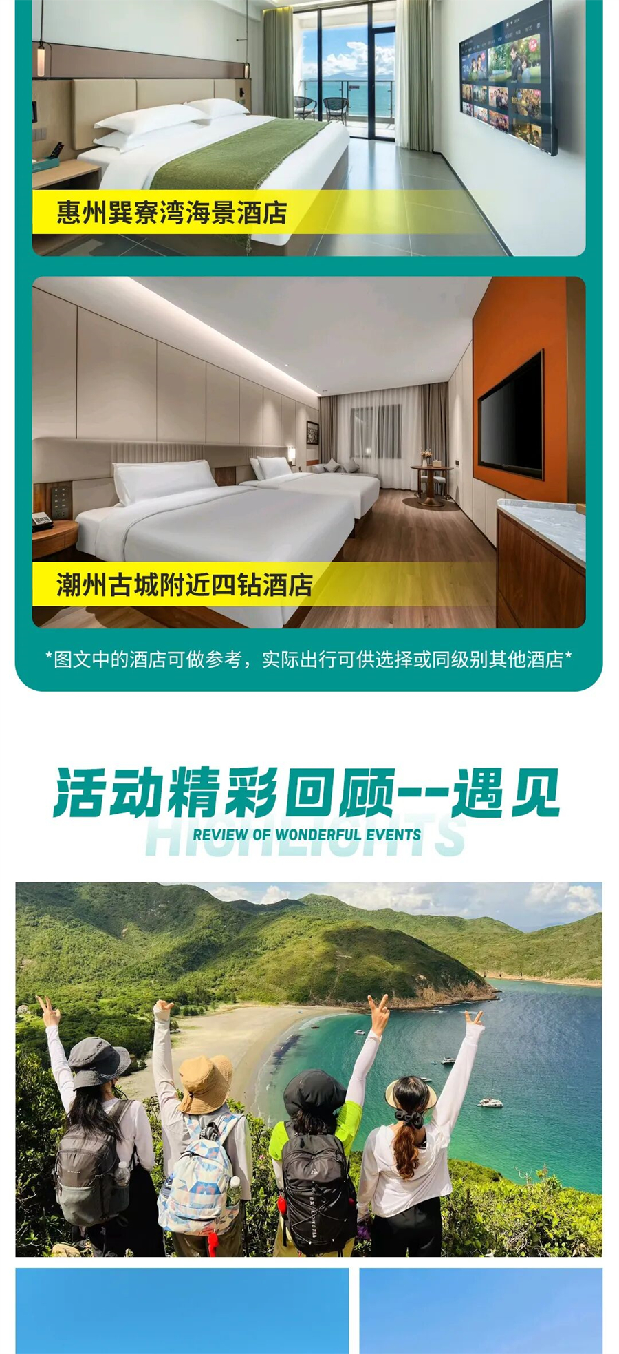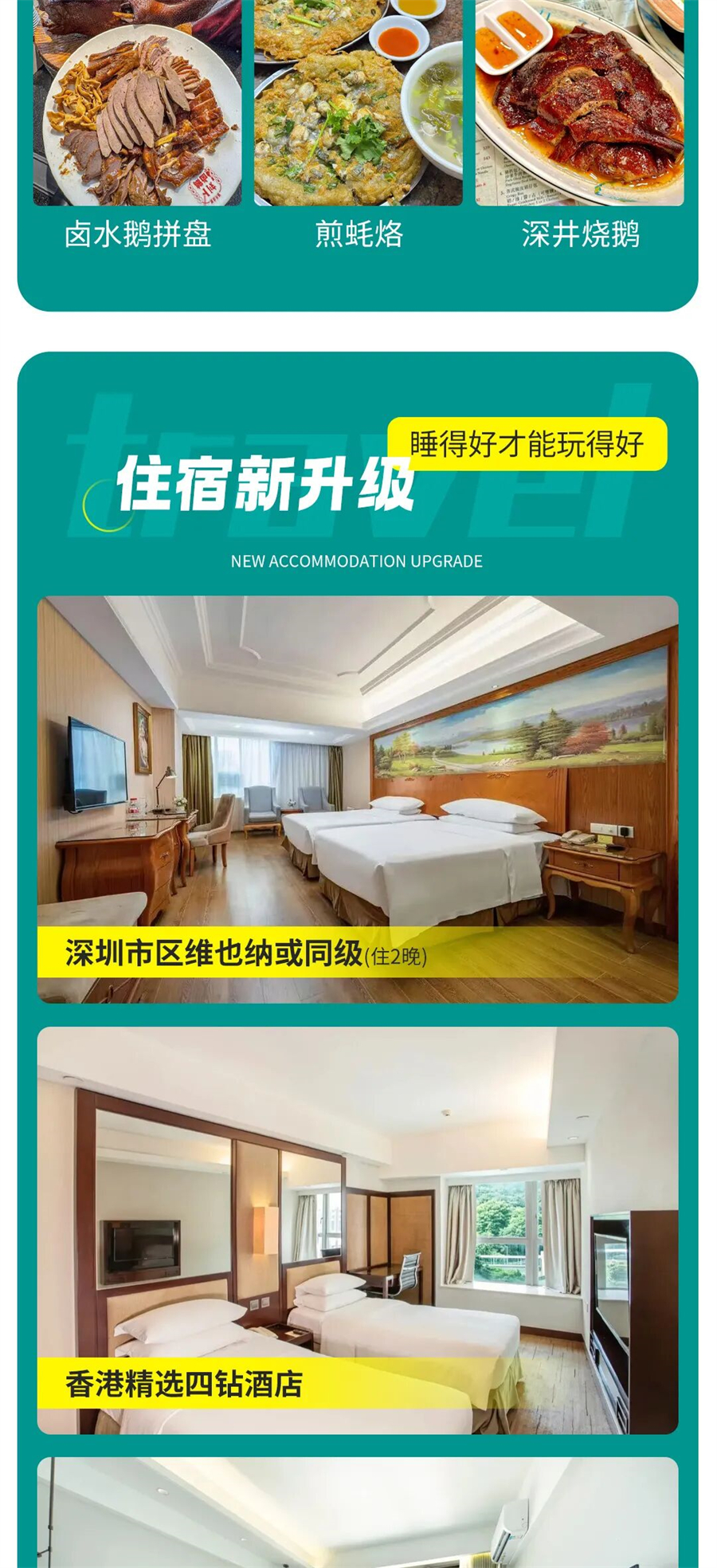4)全程5晚住宿:深圳市区维也纳酒店二晚,香港市区四钻酒店一晚,惠州巽寮湾海景酒店一晚,潮汕地区四钻酒店一晚;