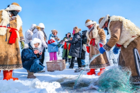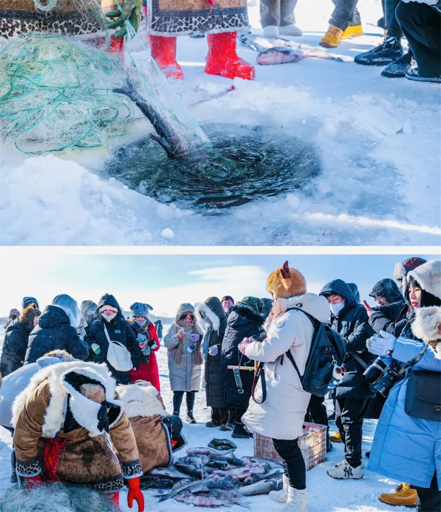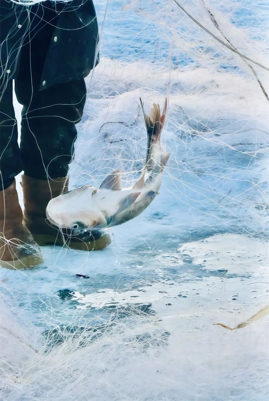 看那渔网缓缓拉起银鳞闪烁,鱼儿跳跃,是大自然最真挚的馈赠,和朋友一起感受这份收获的喜悦,讲述古老的渔猎故事。鲜活的大鱼被捕上冰面的瞬间就被寒冷的空气定格。这一刻冰封的冬季仿佛也被这份收获的喜悦所融化。