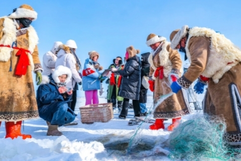 多伦湖的冬捕延续了古老的千年渔猎文化,早在一千多年前的辽金时代,这里就已盛行冬捕,直到今天,冰上渔猎仍然是当地传统的生产习俗。渔民们打眼、破冰、下网,水下走杆,一招一式按照传统步骤逐一还原冬捕过程。