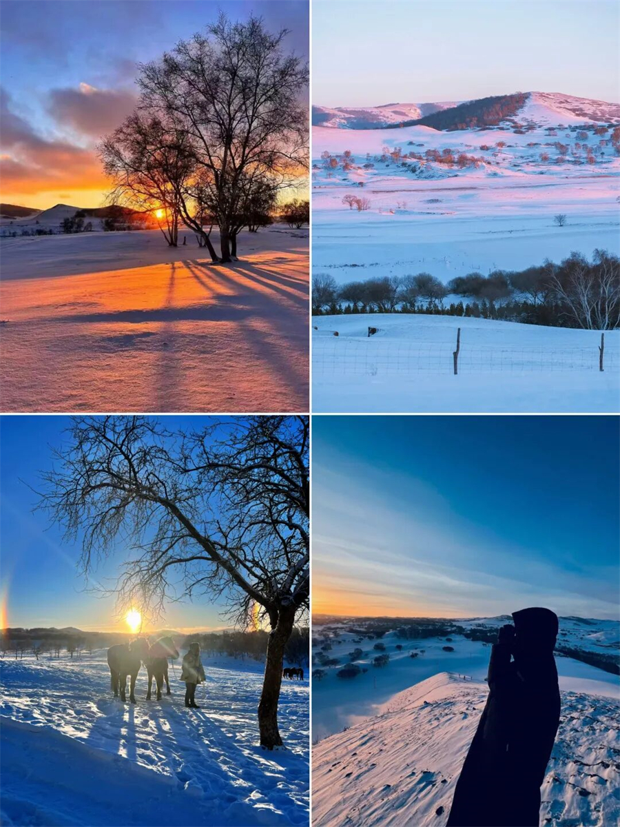 夕阳西下我们驱车来看日落,乌兰布统草原的夕阳,骏马与落日的搭配、光影与自然的交融,天边渐变的红色与蓝色的融合,构成一幅精美的画卷,站在白雪皑皑的草原,欣赏着落日余晖,品味着壮美残阳,看着夕阳一点点从地平线消失,这里有雪丘之上的排排白桦林,在阳光照射下白桦树干与白雪争辉,长长的树影拖在雪丘之下层次分明,温柔铺展一幅绝美画卷。