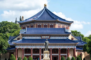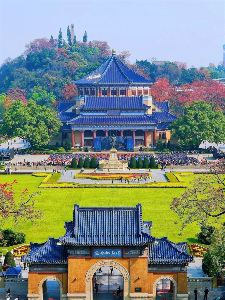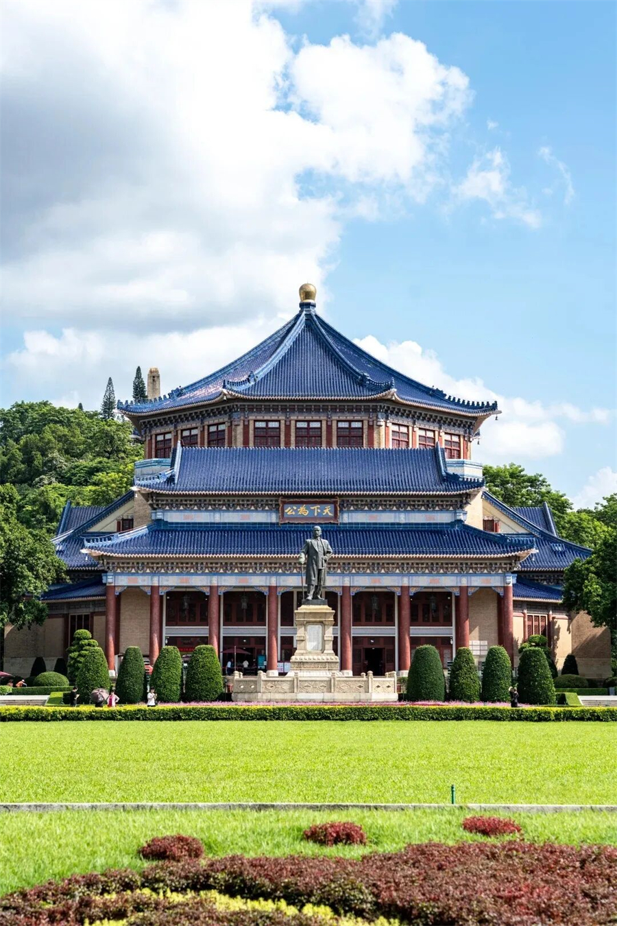 广州中山纪念堂,蓝瓦红柱庄严巍峨,铭记孙中山革命伟业,历史回响萦绕穹顶,“革命尚未成功”之志永续传承。
