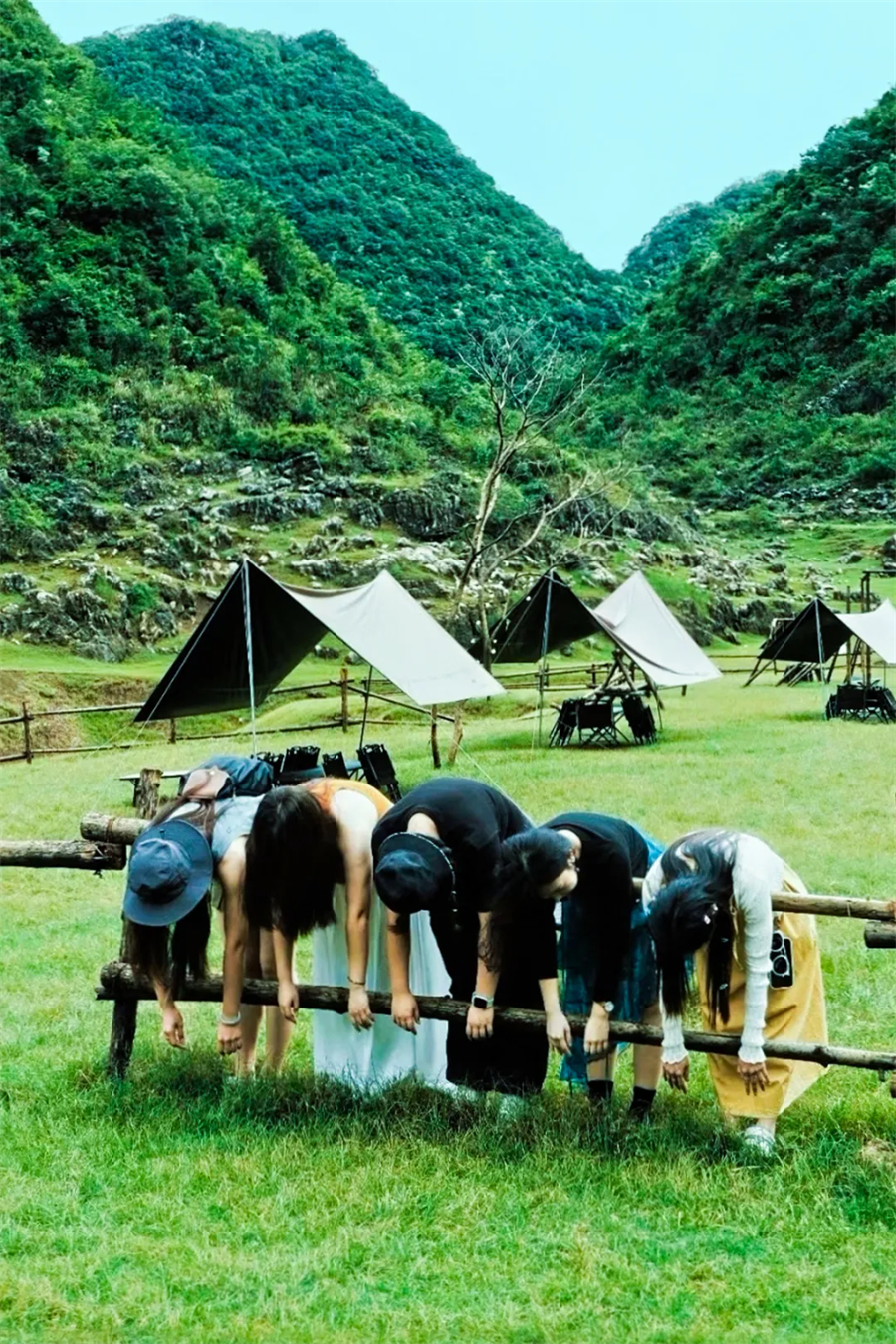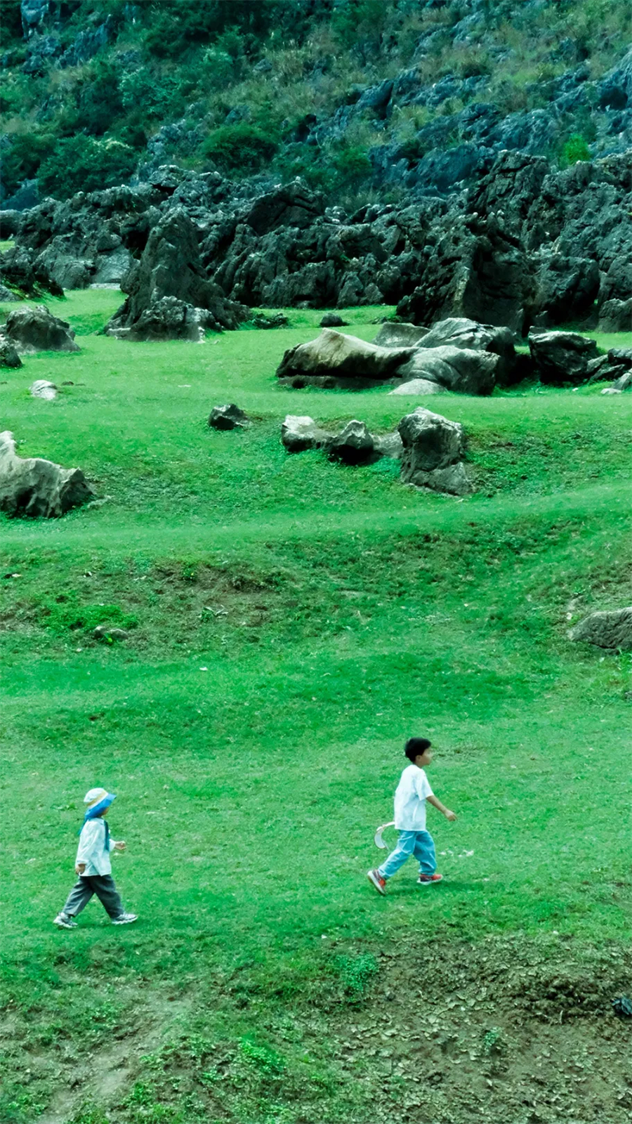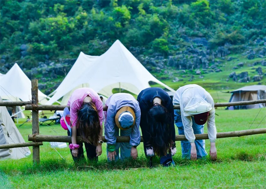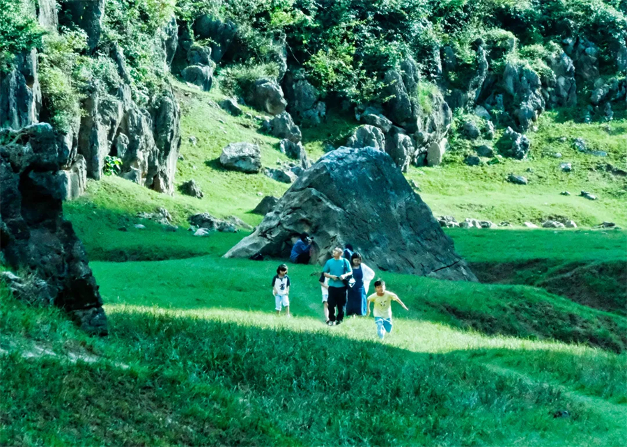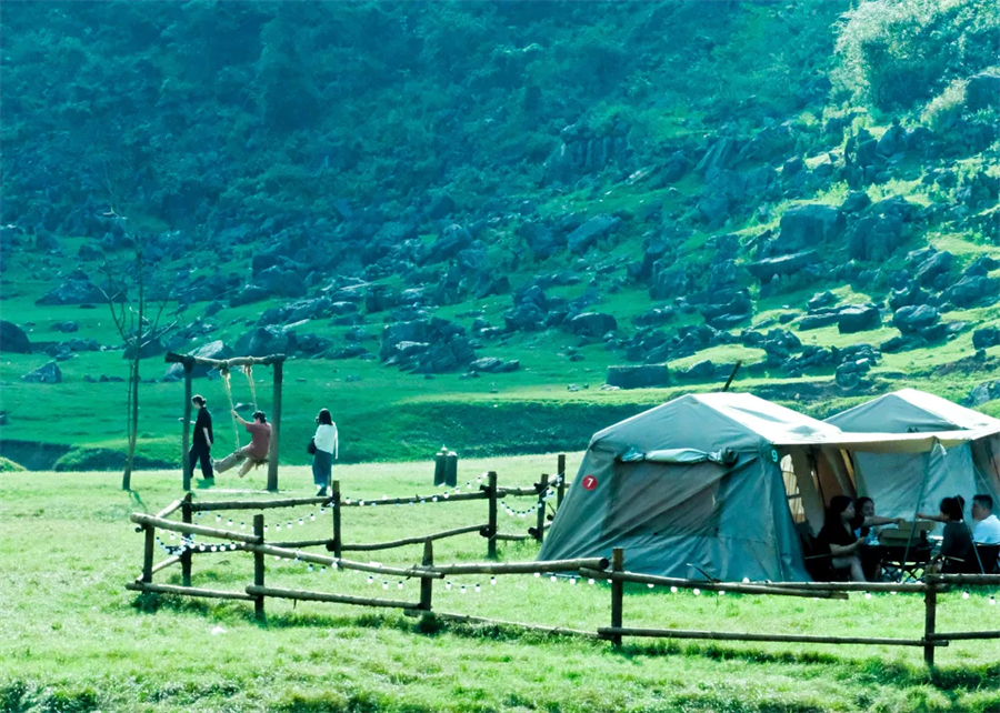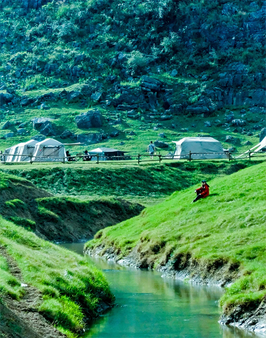抵达停车场,整理好装备穿越露营基地,开始休闲轻徒步,沿途我们将踏过草坪、湿地、打卡崖壁、穿梭小块崖口,5公里的徒步上感受喀斯特秘境,嶙峋的怪石、奔腾的河流、牛马、神秘的岩洞。