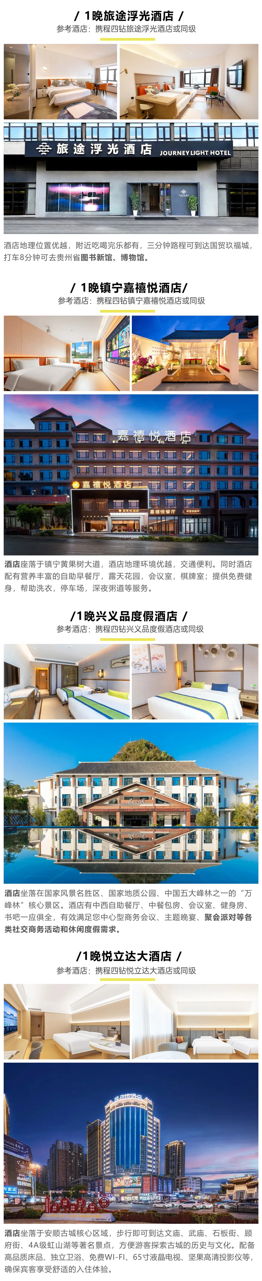 | 全程4晚4钻酒店(酒店默认安排标间双床房,如需加床或升级房型,费用自理) D1旅途浮光酒店 D2嘉禧悦酒店 D3兴义品度假 D4安顺悦立达酒店 |