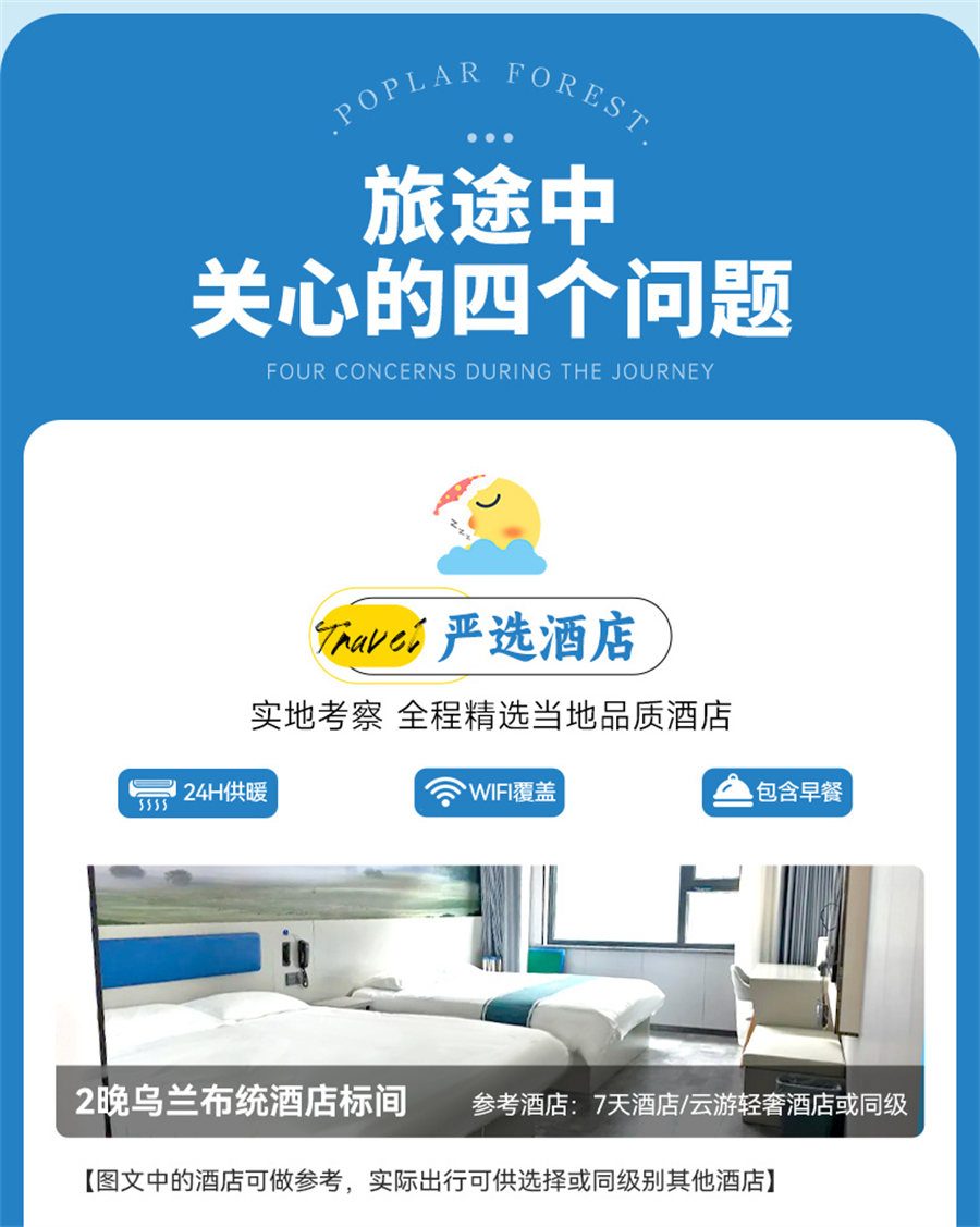 3、住宿:全程2晚乌兰布统当地商务酒店标间(连住2晚)