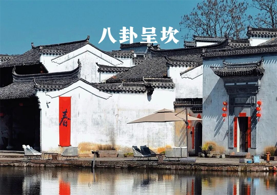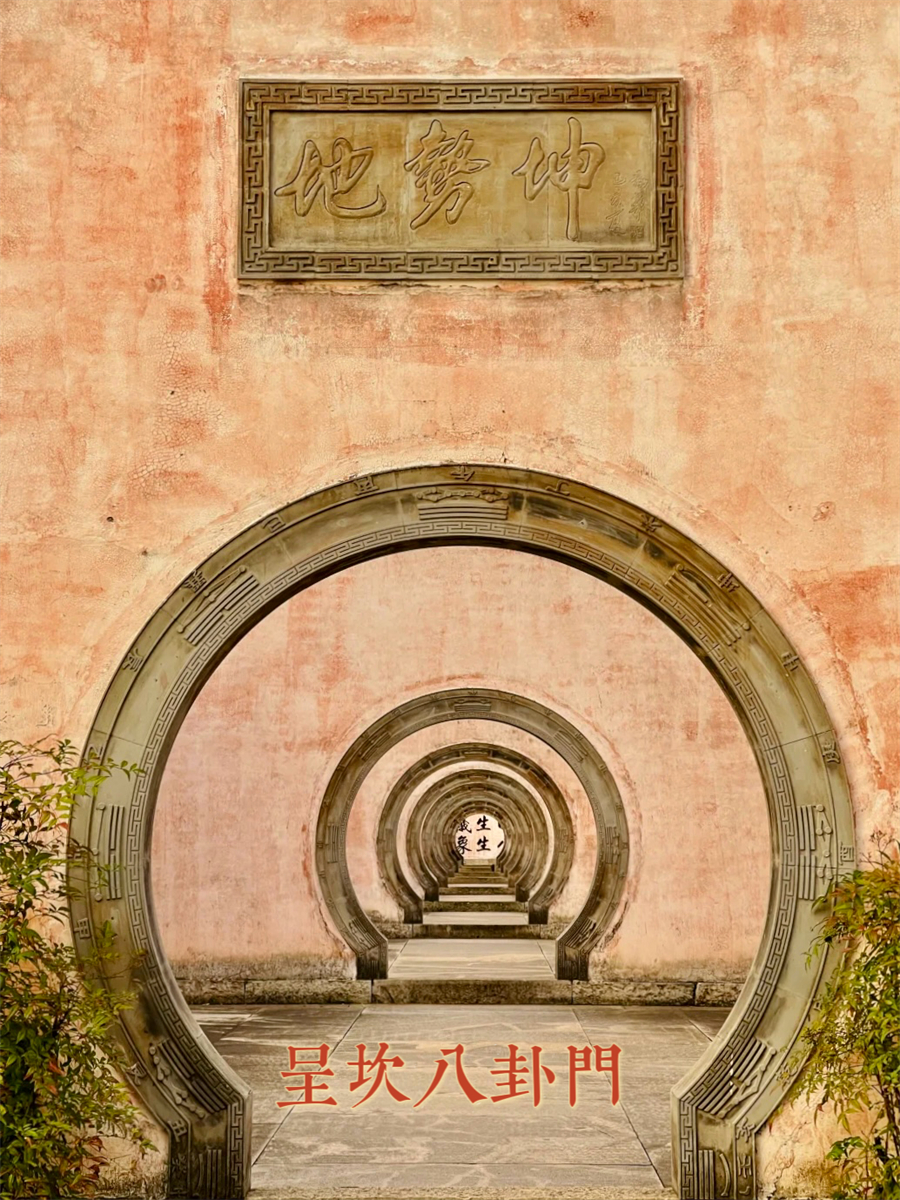 呈坎原名龙溪,始建于东汉三国时期,距今已经1800多年。唐末江西罗氏兄弟搬迁至此后改名呈坎。整个村落按易经“阴(坎)阳(呈)二气统一,天人合一”的八卦布局,三街,九十九巷宛如迷宫。村内古老的龙溪河宛如玉带,呈“S”形至北向南穿村而过,形成八卦阴阳鱼的分界线;村落周边八座大山,自然形成了八卦的八个方位,共同构成了天然八卦布局。