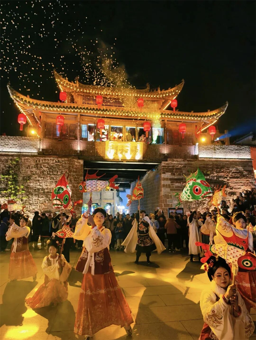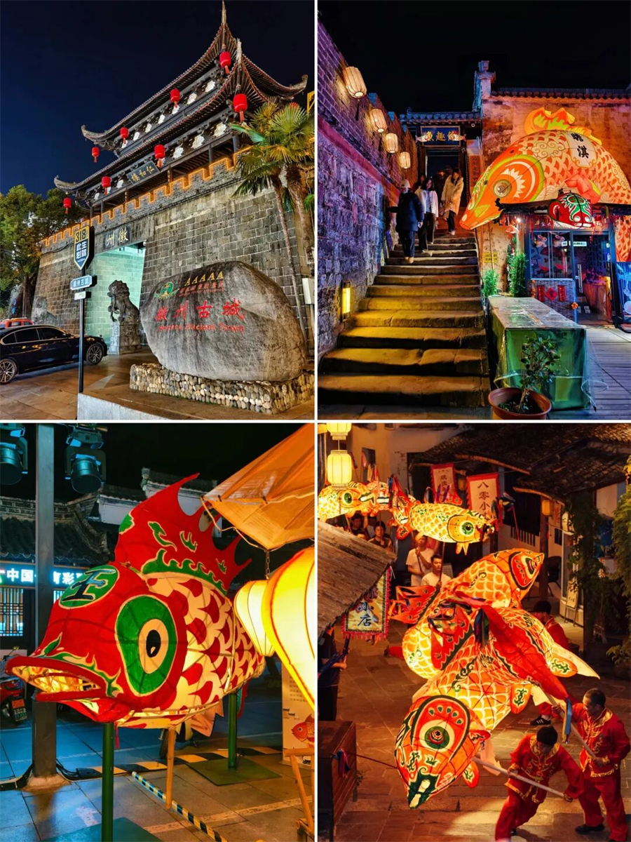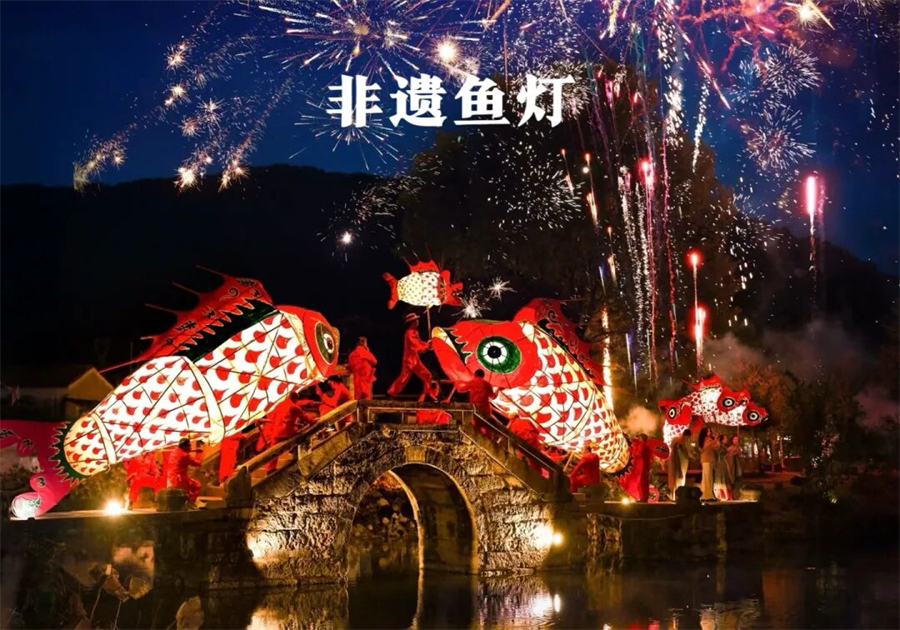 夜幕降临后,村民们身着传统服饰,肩扛大鱼灯,手持小鱼灯的市民与游客紧随其后,鱼灯沿着村里的街道、河畔缓慢游走,或跃动于古桥之上,或穿梭于溪流之间。在举办鱼灯巡游活动时,通常还会融入放河灯、篝火晚会、烟花表演、鱼灯宴等一系列丰富多彩的民俗活动,让游客沉浸式体验徽州传统文化。晚上的篝火和烟花,特别是烟花,超级多!!!有机会的一定要去体验一次在烟花下,篝火边,舞着鱼灯跳着舞的感觉