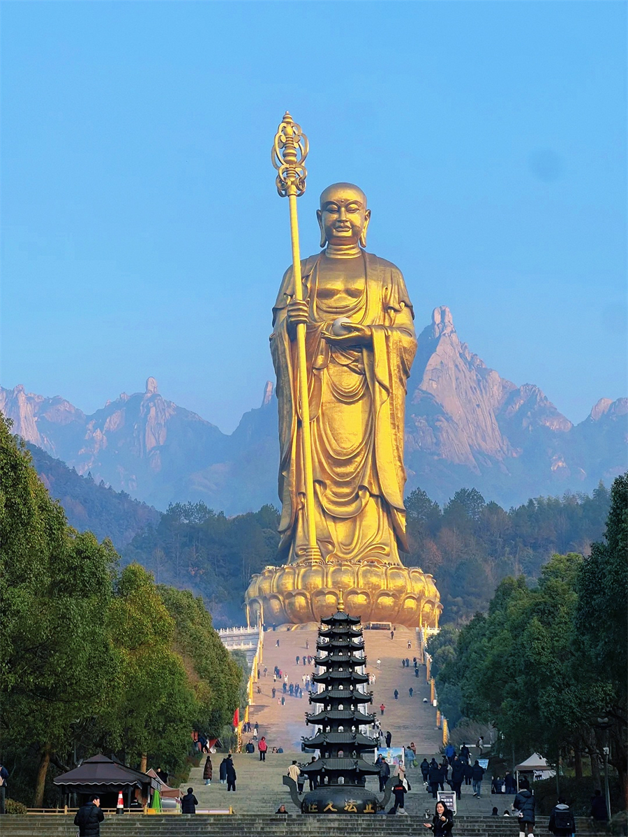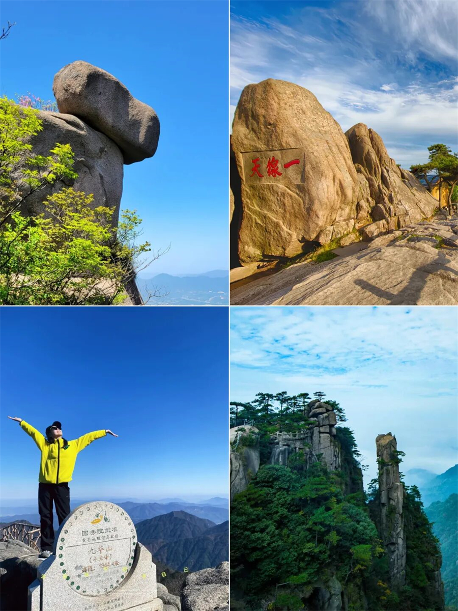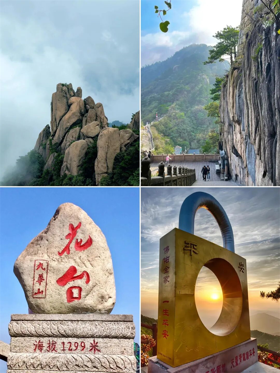 花台-天台景区是九华山最美的一段自然景观,也是网红打卡地。沿途可以欣赏到奇峰怪石、云海雾凇等美景,可以看到母子情深、地藏晒靴、梦幻石谷、睫毛峰、清凉台、小花台等景点。如果运气好,还可以看到天然 佛,由五座峰组成的神奇造型。