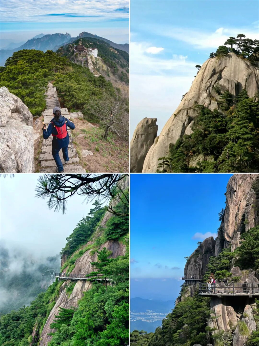 作为一个户外爱好者不甘心走寻常路,从天台徒步穿越至花台,一路都有指示牌,不用担心走丢,风景绝美,各种梦幻奇石、松树……感觉这一路的风景才是九华山景区的精华所在,在花台景区有一个长度约1.4公里,高度一千一百多米的高空栈道,推荐走走。