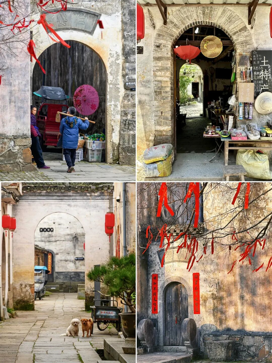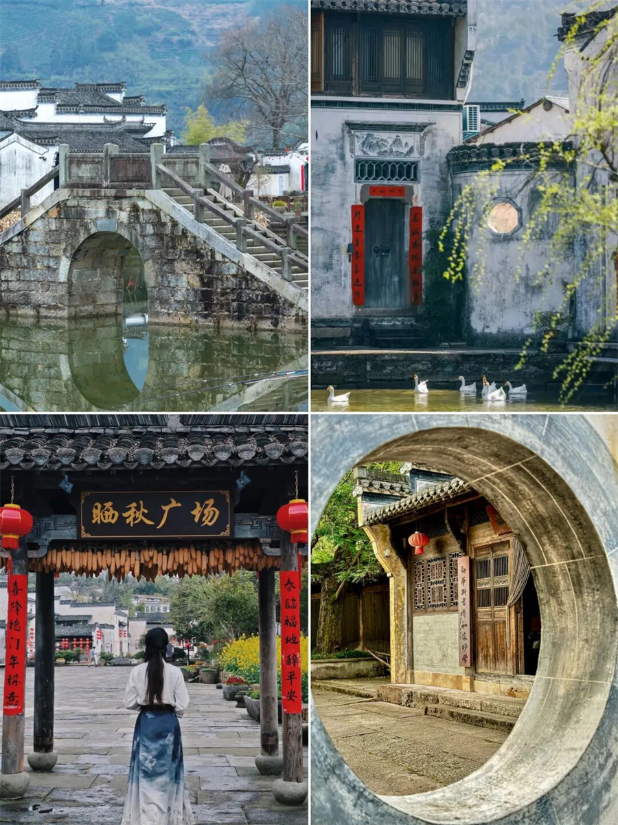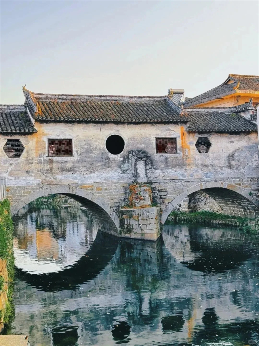 这里几乎保留了最原始的古村风貌 流连于古街古巷 出入古宅古祠 信步在青石板路上 仿佛走进了一幅徐徐展开的水墨丹青画卷 石拱桥静静伫立 连同塘边鳞次栉比的徽派民居一同倒映在如镜湖面 远村升起或青或白的袅袅炊烟 不时有村民出来溪边浆洗 携幼子嬉笑而归 古村里一半是人间烟火 一半是诗情画意 时光也在乡村清静幽适的闲居情调里慢了下来 。