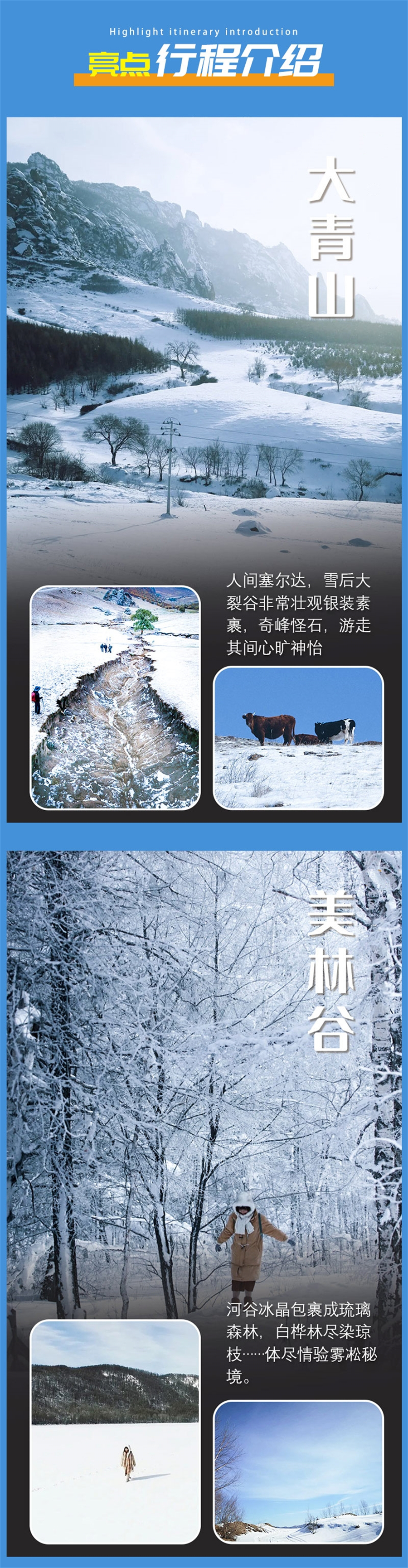 D1 | 北京-美林谷徒步(8公里,爬升370米,约3.5小时)-赤峰(宿)按集合信息时间地点集合出发。约抵达美林谷,徒步野餐,冬天的美林谷,是一片银装素裹的世界。连绵的山峦宛如银龙蜿蜒,雪道似白色绸带从山顶垂下。雾霭飘渺中,风机摇曳,阳光洒下,给雪坡镀上一层金色光辉。雪场里,滑雪者身姿矫健,欢声笑语回荡,充满冬日活力。冬日美林谷徒步,踏雪穿行林海雪原!松枝缀满白雪,踩上去咯吱作响,雾凇如水晶挂枝,阳光穿透林间洒下斑驳金影。步道沿山谷蜿蜒,两侧银峰耸立,偶有松鼠跃过雪地,留下细碎爪印。寒风裹着松针清香,呼吸间满是凛冽清新,全程无陡坡,既能沉浸式感受雪国静谧,又能收获徒步的惬意与治愈~下午徒步结束后,适时前往赤峰, 办理入住,可约伴体验正宗蒙餐,把酒言欢。