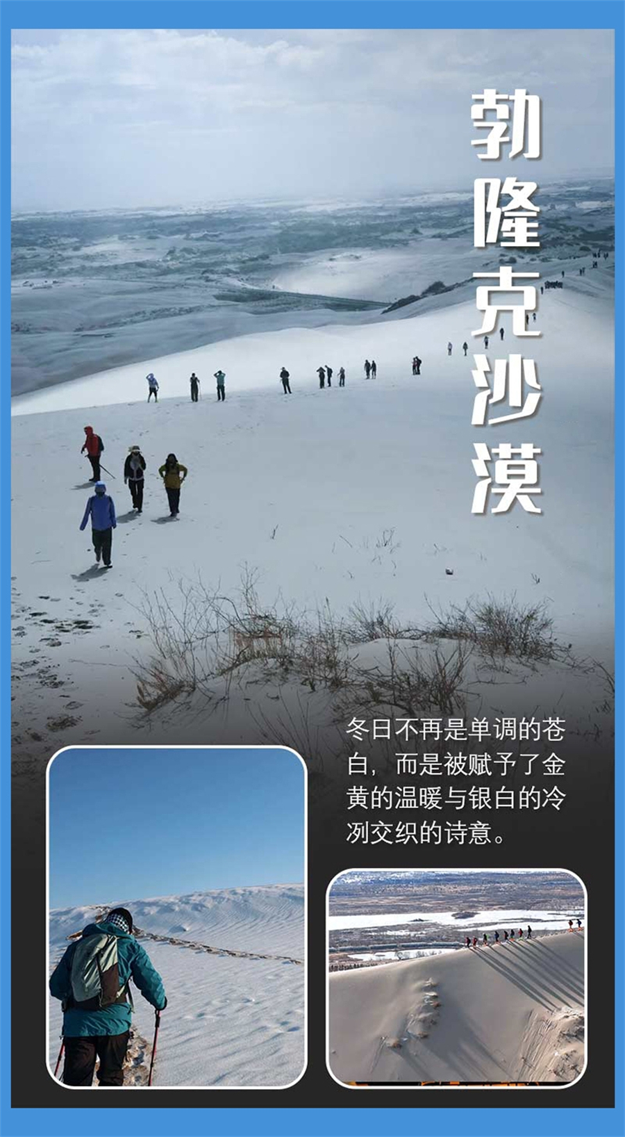D3 | 乌丹-勃隆克沙漠(7公里,爬升170米,约2.5小时)-北京早餐后我们前往勃克隆沙漠轻徒步。此线路不进景区,徒步穿越沙漠活动,用脚丈量沙漠,用心行走天际,冬季(通常为11月至次年3月)的勃隆克,褪去了旅游旺季的喧嚣,展现出一种苍凉而纯净的极致之美。上午适时集合返京,约晚上抵达北京,结束三天徒步之旅!*以上行程时间及顺序供参考,受天气、交通、景区调控及队员体能等不同影响有可能会调整,以领队实际安排为准。