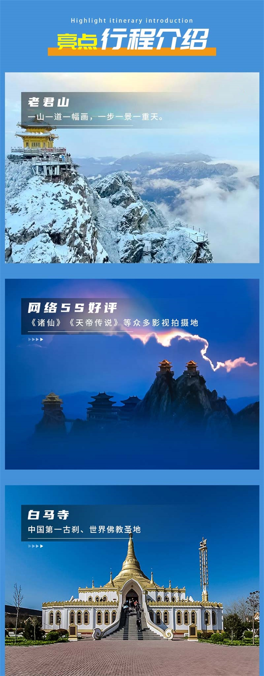 2)门票:老君山门票+中灵往返索道团体220元,龙门石窟90元自行网上预约,白马寺35元;价格供参考,以景区实际政策为准。