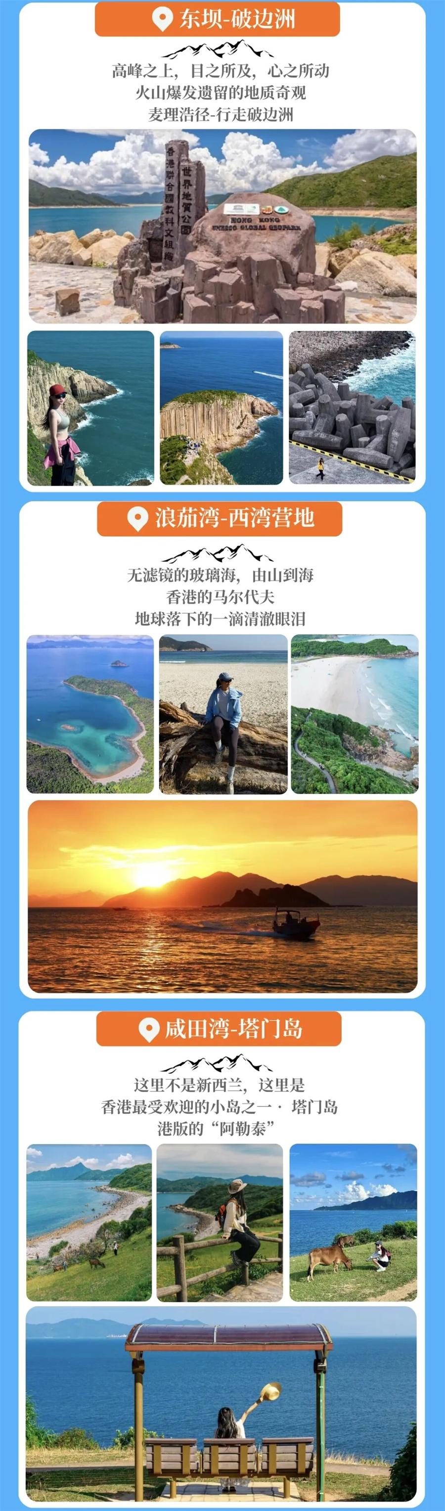 早上根据日出时间定个闹钟,看海湾日出,早餐,回笼觉自然醒,沙滩日光浴,随后西湾出发到经过【咸田湾】到达赤径营地(坐大飞前往塔门岛)