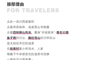 4、服务范围:专业策划和操作四川、云南、西藏、甘肃、贵州、青海、新疆等区域特色旅游路线;团队旅行、企业团建、同学聚会、家庭出行、蜜月旅行等特色定制,定制你的专属旅行! |