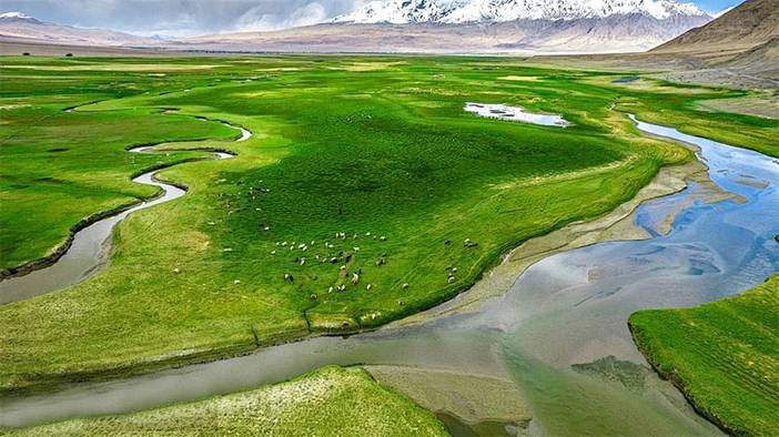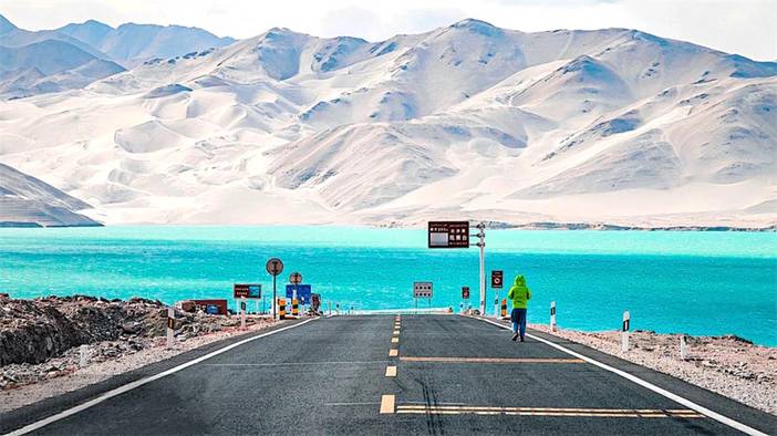 DAY8.塔县—瓦罕走廊—盘龙古道—班迪尔蓝湖—帕米尔之眼—塔合曼湿地—喀什今日出发去瓦罕走廊打卡,瓦罕走廊是古丝绸之路的一部分,也是华夏文明与印度文明交流的重要通道。适时去网红打卡圣地——盘龙古道,这条公路拥有弯道600多个,其外型犹如一条黑色巨龙盘绕在昆仑山脉,一路蜿蜒而下,实在壮观。而后来到班迪尔蓝湖参观,班迪尔蓝湖做为帕米尔高原的小众风景,雪山、蓝湖、荒野,仿佛到了世界尽头,非常具有美感。后经过帕米尔之眼,这是一处由冰川侵蚀和风化作用形成的环形地貌,直径近百米,中心凹陷,突起的巨石,远观宛如一只凝视天空的“眼睛”,让人感觉到巨物恐惧症。后前往喀什,途中游玩塔合曼湿地,连绵不绝的雪山威然屹立着,蜿蜒的河流与青葱的牧场点缀其中,像极了一幅色彩鲜明的油画。抵达喀什后入住酒店。