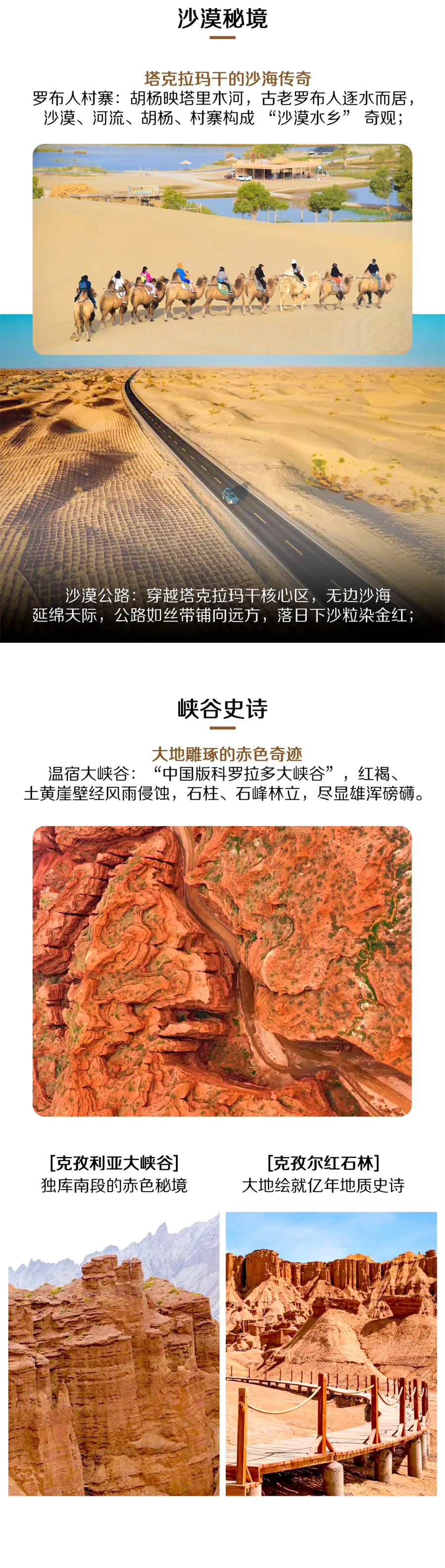 DAY5.阿拉尔—塔里木河大桥—沙漠公路—团城—和田夜市今日早起出发,我们将自北向南穿越塔克拉玛干沙漠,途中观景台可以去沙漠里走走拍拍,感受世界第二大流动沙漠的无垠与浩渺。这里有不少野生胡杨,据说每棵胡杨树都超过千年,没有叶子的胡杨反而有一种苍劲刚毅之美。适时抵达和田团城,团城是和田老城区的核心部分,经过北京援建改造后,成为了一个既保留传统风貌又充满生活气息的特色街区。游览结束可结伴前往和田夜市品尝烤三蛋、烤鸽子、烤包子等当地特色小吃,后返回酒店。