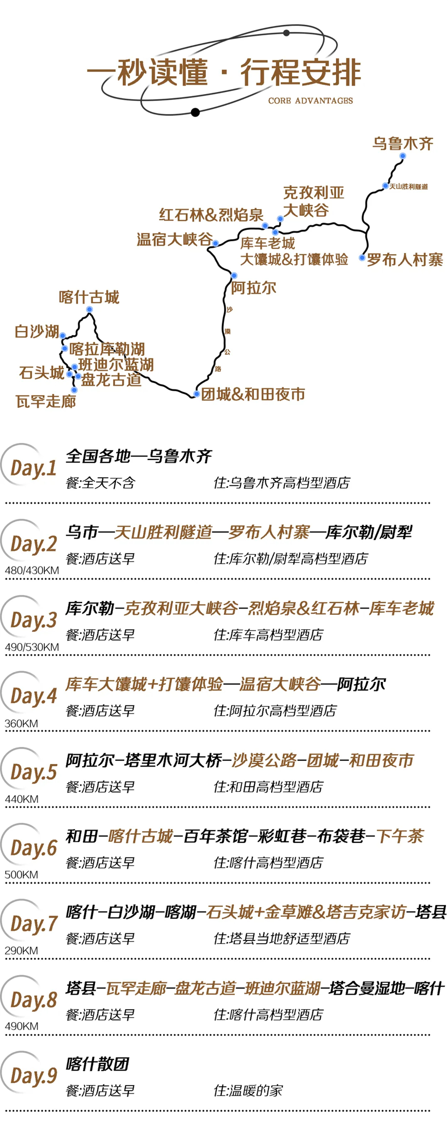 5人包团,安排7座商务舱,每人+600元4人包团,安排7座商务舱,每人+1200元4人包团,安排5座SUV,每人+700元3人包团,安排5座SUV,每人+1300元2人包团,安排5座SUV,每人+2200元 备注:高端定制,费用另议(含住宿升级、用车升级、跟拍等服务升级) 儿童费用说明:儿童(指身高在1.4M及以下),儿童费用不包含住宿及早餐(其它同成人),如门票有优惠,会按照团队折扣价退还相应的差价。注意:1大1小报名无法安排拼房,敬请谅解! 温馨提示:本路线接受外籍及港澳台团友报名!因部分景点受边防政策等原因影响,为了避免造成不便,请报名时提前跟工作人员进行沟通落实。费用包含1:领队:无领队!司机协助购买景点门票,协助办理酒店入住手续,恕不提供景点讲解服务,无法陪同进入景区。旅行管家提供24小时在线服务,包含景点信息,游玩建议等;2:门票:全程景点首道大门票+区间车:罗布人村寨门票+区间车、克孜利亚大峡谷门票+区间车、克孜尔红石林+烈焰泉门票+区间车、库车大馕城门票、温宿大峡谷门票+区间车、帕米尔旅游区(石头城+金草滩)门票+区间车。(赠送大馕城打馕体验、喀什古城下午茶,塔吉克家访+换装体验,不去不退)。备注:如持有真实的学生证、老年证、记者证、残疾证、现役军官/军退证、现役警察证等享受免票或者优惠证件者,请在司机购票之前出示并交于司机(具体优惠标准以景区实际为准),司机会在行程最后一天统一退还门票优惠。(因接待方购买的是景区折扣票,优惠减免是按照接待方折扣价退还,不以景区挂牌价退还,请勿纠结!)进入景区时,景区会要求本人出示身份证和优惠证件进行人工或者系统查验,如使用伪造证件,造成补票、罚款、拘留、耽误集体行程等,后果请自行承担(另:新疆各景区免票身高和年龄不一,对优惠证件的承认也各有不同,均以景区最新规定为准)3:住宿:全程共8晚住宿(高档型为携程四钻或当地四星,舒适型为携程三钻或两钻或当地三星)D1:乌鲁木齐高档型酒店标准间D2:库尔勒/尉犁高档型酒店标准间D3:库车高档型酒店标准间D4:阿拉尔高档型酒店标准间D5:和田高档型酒店标准间D6:喀什高档型酒店标准间D7:塔县当地舒适型酒店标准间D8:喀什高档型酒店标准间4:交通:全程特别安排7座头等舱或7座商务舱或5座SUV,不指定车型(6人安排7座头等舱、4-5人安排7座商务舱,2-3人安排5座SUV),保证一人一正座;(所有座位队员轮换制)。5:用餐:部分酒店赠送早餐,不吃不退(当地早餐比较简单,景区内大多以稀饭馒头小菜等为主,不保证有鸡蛋);全程用餐均自理。6:组织:活动组织成本费。费用不含1. 大交通:各地往返乌鲁木齐或喀什的大交通费用。2. 全程餐费自理(中午过路餐一般由司机推荐,晚上有自由时间,可以结伴寻觅美食,方便,现场AA,丰俭由己)。3. 门票:白沙湖、喀拉库勒湖因沿途就可以看到,司机会给大家时间拍照,如需进入景区,请自行购买门票;喀什古城、瓦罕走廊、盘龙古道、班迪尔蓝湖、塔合曼湿地暂未收取门票费用,如产生费用请各位队员自理。4. 单房差说明:单人报名者我们会安排同性游客及司陪拼房,拼住房型为标准两人间(如遇游客爆满,酒店依据实际情况调整三人间),介意与陌生人拼房或睡眠较轻者请自补房差单住,以及一大人携带一名儿童者,请自补单房差:第一期至第三期1000;第四期至第七期1100;第八期至第十二期1200,第十三期至第二十四期1300;5. 发票:此报价不含发票,如需开具发票,请另行补税点。6. 因交通延阻、罢工、军事管制、天气、飞机、火车故障、景点关闭、航班取消或更改时间等不可抗力或不可预见因素导致部分景点无法游览,组织方不承担任何责任,由此导致的费用增加,由队员自理。