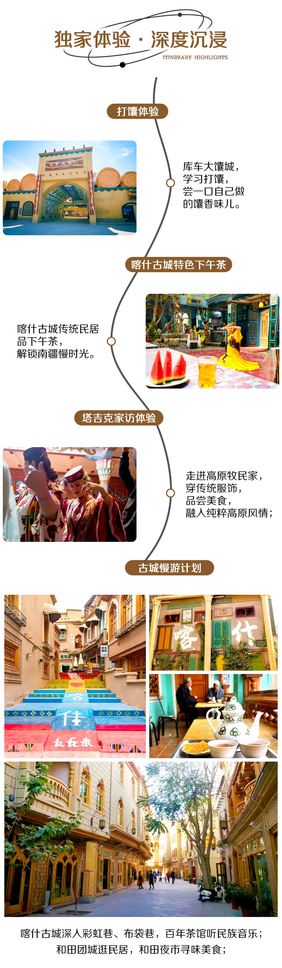 DAY6.和田—喀什古城—百年茶馆—彩虹巷—布袋巷—下午茶今日出发前往喀什,喀什古城有着悠久的历史,距今已有2000余年,它如同一本沉甸甸的古老书籍,厚重而充满故事。不同于国内大多数古城的徽派建筑,它保留了自己独特的异域风情,将历史与现代、东方与西方完美的融合。古城里老人蹒跚的脚步,孩童踢球的身影,姑娘嬉笑的面庞...都是古城的日常,仿佛时间在这里慢了下来。去艾提尕尔广场晒晒太阳,这里有着新疆最大的清真寺(如进入门票自理);可以去彩虹巷,布袋巷打个卡,幽深的窄巷,记录了千年的过眼云烟;去百年茶馆品品茶,飘扬的茶香,错落的琴声浓缩了喀什好几代人的美好记忆;逛累了去享用今日下午茶,后前往酒店入住。