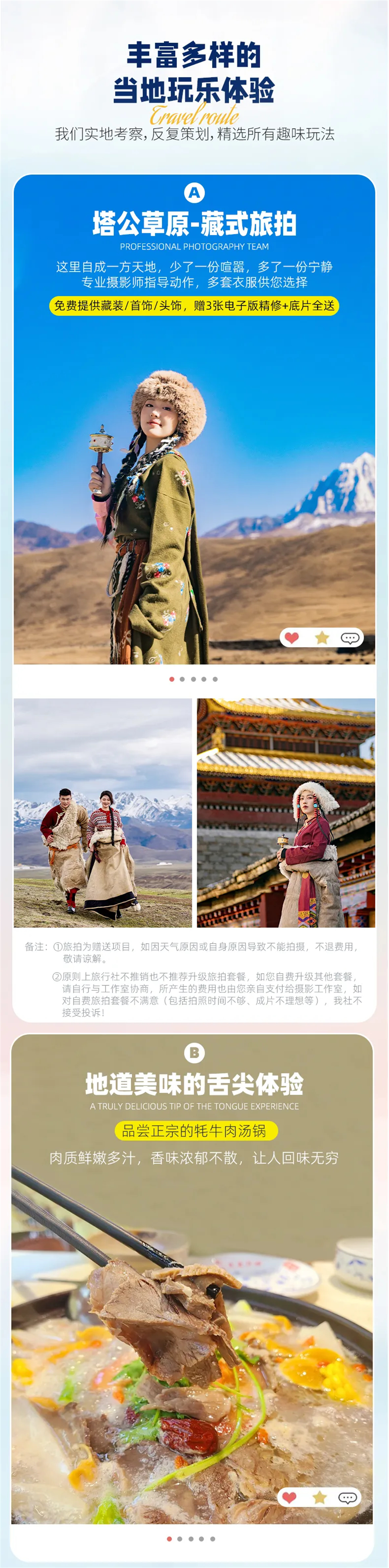 3、驻地藏式旅拍1次(免费提供藏装/首饰,赠3张电子版简修,底片全送);