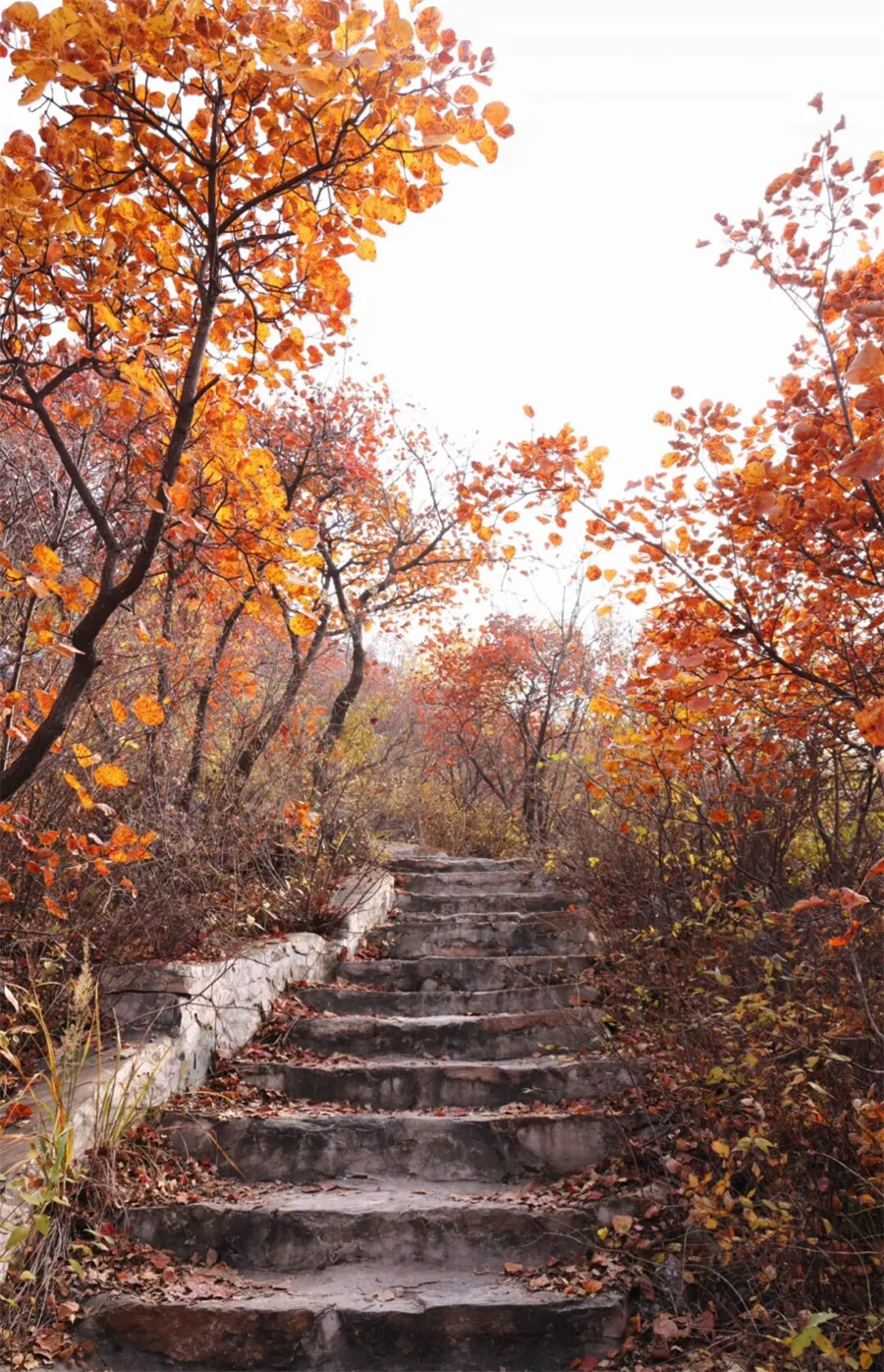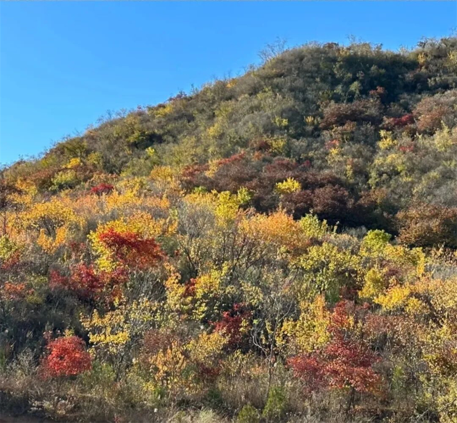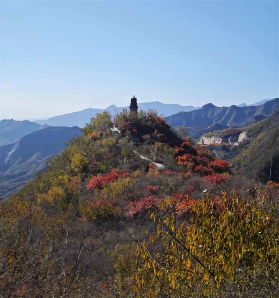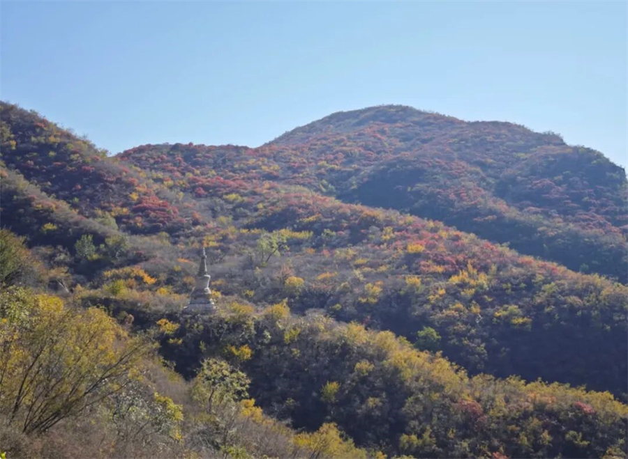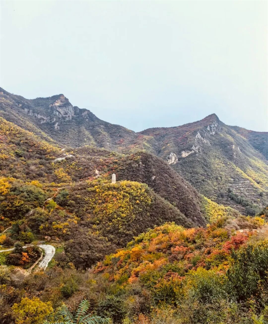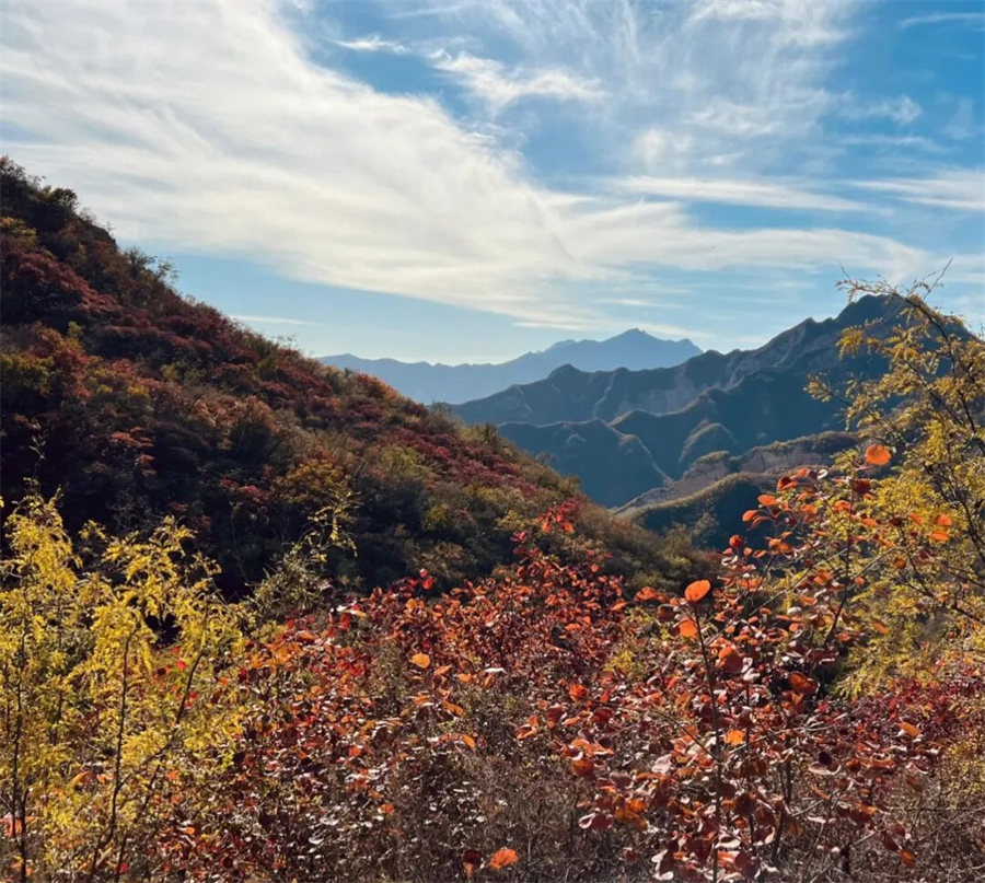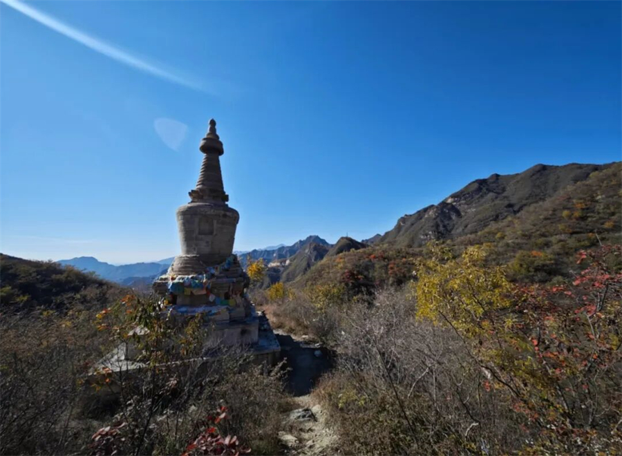 09:30|上午到达徒步起点鲁家滩,在领队带领下开始环线穿越。谷积山位于房山区与门头沟区交界处,海拔711米,属西山。山势和缓,附近山间多古迹,有喇嘛庙、石碑、宝塔等,徒步全程大多为碎石路,犬牙差互,也有些土路,有些则必须翻越石头,两边山路都是打凿岩石穿山而成。
