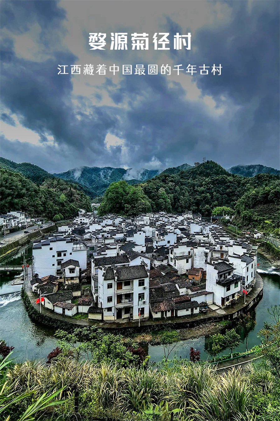 菊径村始建于宋代初期,位于江西省上饶市婺源县大鄣山乡。全村共390余户1400余人,下辖7个自然村,5个村民小组,耕地面积616亩,林地面积21467亩,2014年人均收入为4500元。整个村庄布局独特,文化底蕴深厚,是个典型的山环水绕型村庄,四周高山环绕,一条小溪环绕整个村庄,符合中国的八卦“后山前水”设计,被誉为“中国最圆的村庄”,犹如世外桃源。