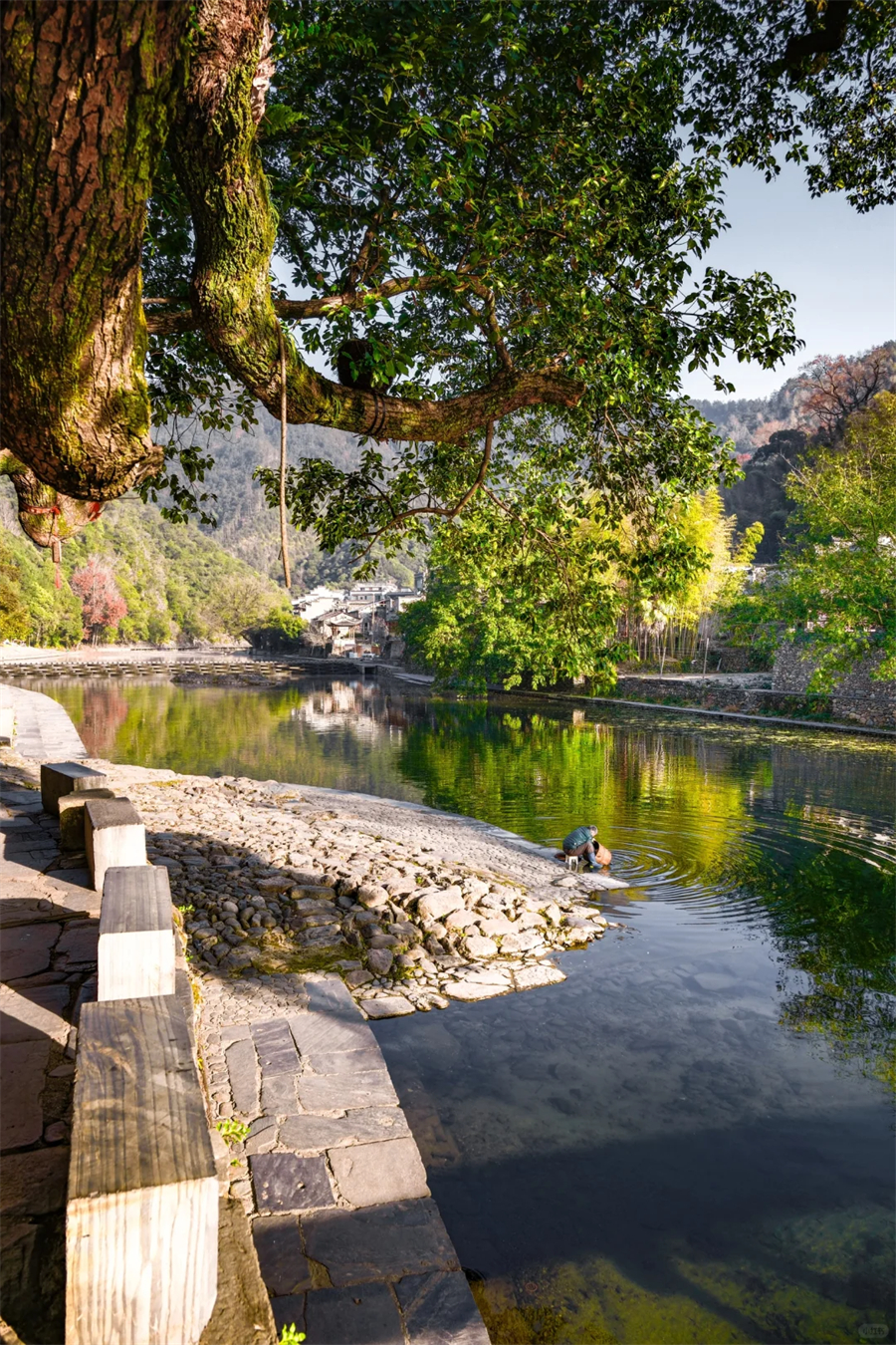 月亮湾是半路上的一处小景点,因恰如月亮的形态、隔岸徽派民居的典雅、周边秀美的景色相融合。偶有三五农妇临湖浆洗,时常引得路人纷纷驻足,深得游客喜爱,拍摄此时美景。以至成为摄影爱好者们最佳拍摄地之一。