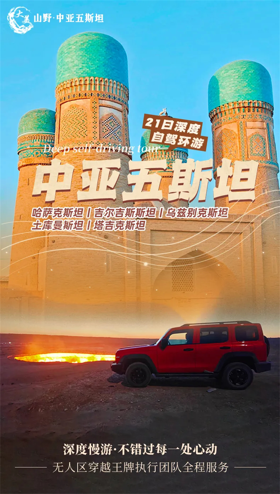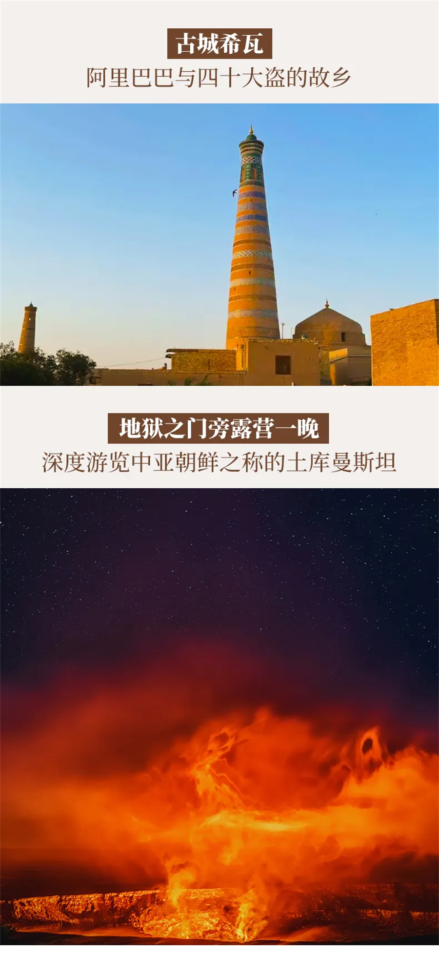 【行程概述】在希瓦古城的晨曦中醒来,伴随着宣理塔传来的声音,我们即将离开乌兹别克斯坦,前往中亚五斯坦最神秘的目的地,有着中亚朝鲜之称的土库曼斯坦,用提前申请好的邀请函,在乌土海关办理入境签证,在为车辆缴纳完高额的环保税后,我们正式进入土库曼斯坦,在达绍古兹之前,路况尚可以接受,之后前往地狱之门景区的路况只能用颠簸来形容,好在土库曼斯坦有世界上最便宜的油价,大家不用心疼车辆费油,下午或者晚上抵达地狱之门景区,如果大家觉得晚上沙漠气温低了,可以来到地狱之门旁边烤烤火。