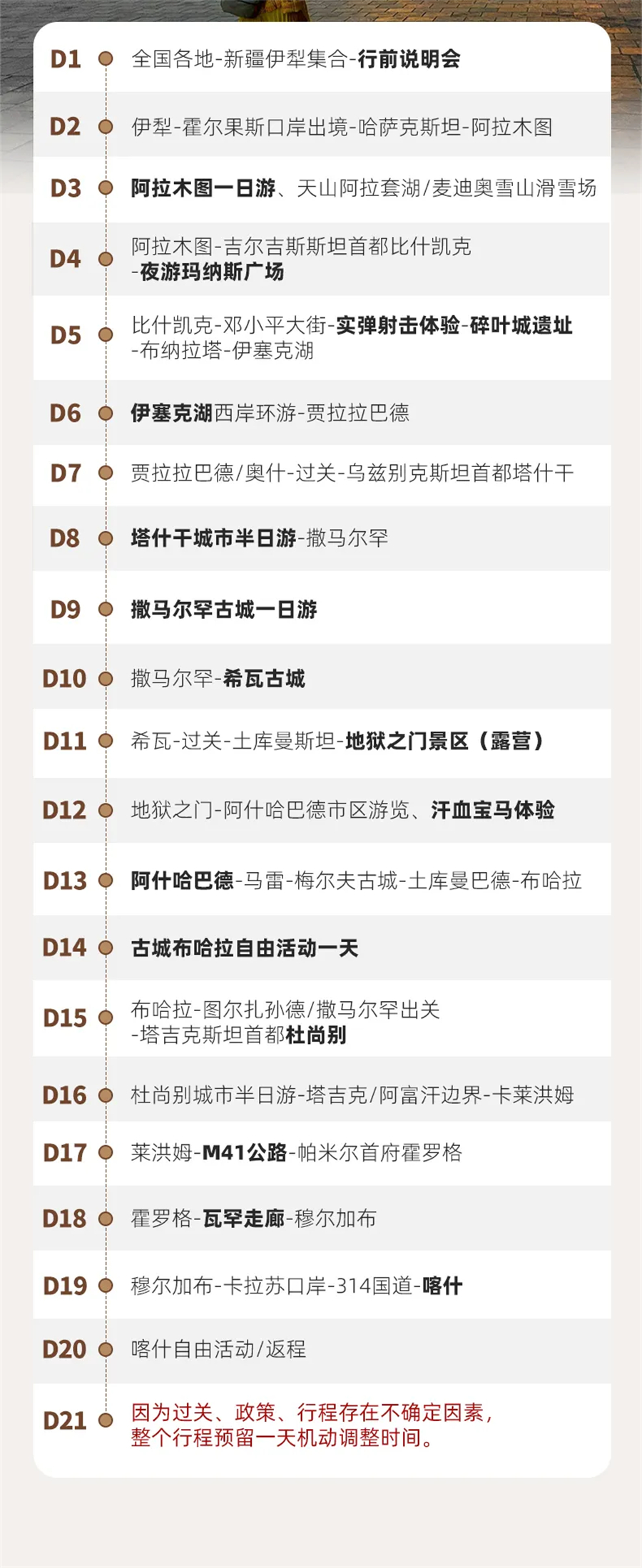 因为过关、政策、行程存在不确定因素,整个行程预留一天。额外增加的一天旅行时间,无需队员承担多支出的餐费、住宿费用等,如果整个行程在第20天已经结束,则第21天机动行程自动取消,如果超过一天时间,额外增加的旅行费用,由全部旅行人员(包括工作人员)共同分担。此点望大家知晓,并理解。备注:根据实际情况调整各景点参观顺序,但保证大致节点不变;因封关道路等原因无法参观的景点,可以调整为别的景点。
