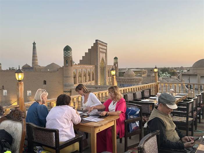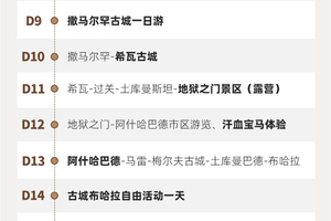 D10:撒马尔罕-希瓦古城 【行程概述】酒店早餐后,告别撒马尔罕前往曾经的花喇子模-小城希瓦,下午抵达希瓦,希瓦古城保存完好,是阿里巴巴与四十大盗故事的发生地,古城内历史建筑与当地民居错落分置,进入希瓦古城是不需要买门票的,但是如果要进入古城内的小景点就需要买门票了,可以单独买票,也可以买联票,一般两日有效,大家可以根据自身喜好自行决定是否购买,晚餐大家可以安排在古城西门的三楼饭店,一边欣赏古城落日,一边吃晚餐。