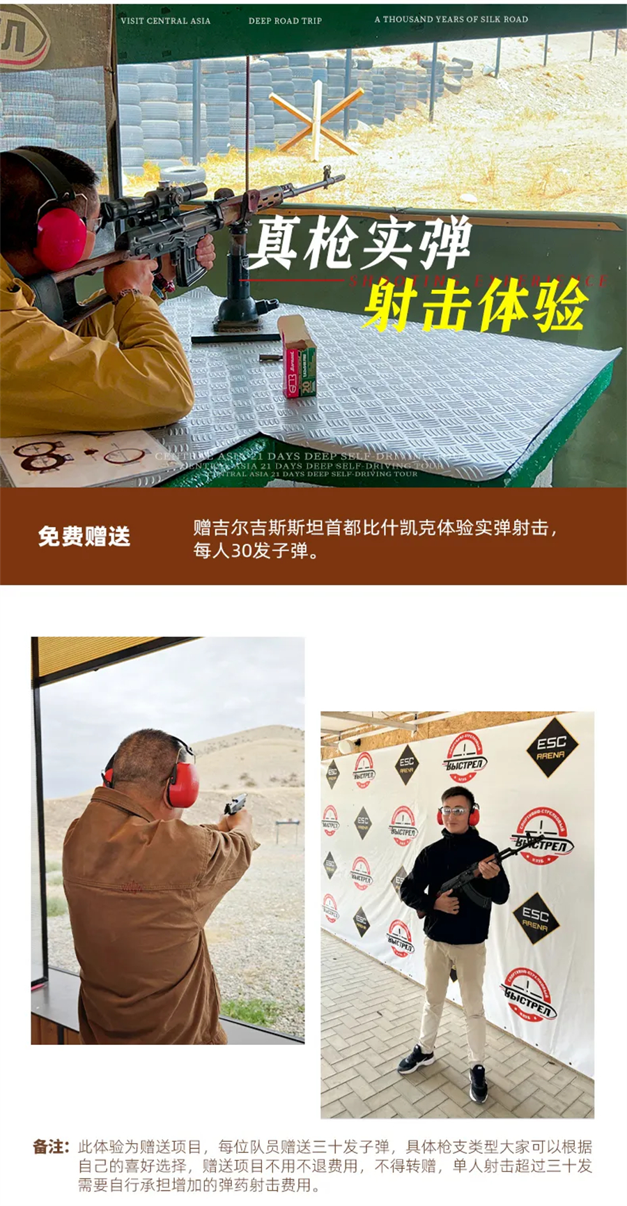 【行程概述】早餐后,从酒店开车前往邓小平大街,邓小平大街原名列宁大街,位于比什凯克城市主干道的延长线上,用邓公之名命名此道路,彰显了吉尔吉斯斯坦改革发展的决心,街道上竖有邓公雕塑;参观游览完邓小平大街之后,我们前往比什凯克郊区的真枪实弹射击体验馆,在这里大家可以根据个人喜欢选择手枪、狙击枪、步枪、散弹枪、冲锋枪进行射击体验;比什凯克郊区午餐后,前往李白出生地、曾经的唐朝安西四镇之一的碎叶城遗址,目前碎叶城遗址不收门票、没有景交车、也没有专人看守,大家可以在遗址内自由活动、深度接触,之后参观游览诗歌之塔-布纳拉塔,体力好的队员还可以登高俯瞰,晚上住在伊塞克湖西岸的小镇布雷克其。注:比什凯克射击体验项目为赠送项目,每位参团队员赠送三十发子弹,具体枪支类型大家可以根据自己喜好选择,赠送项目不用不退费用,不得转赠,单人射击超过三十发需要自行承担增加的弹药射击费用。
