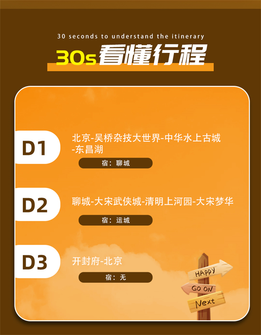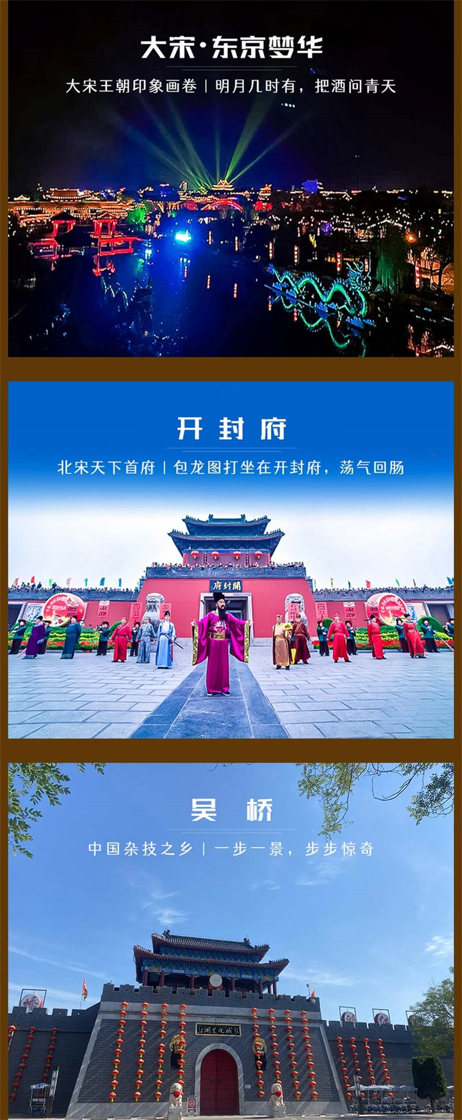 2)门票:清明上河园门票120元,《东京梦华》演出票需提前自行预约第一场,开封府门票65元(团体59元),大宋武侠城门票100元(团体95元),吴桥杂技大世界门票120元(团体100元);以上门票价格供参考,以景区实际规定为准。