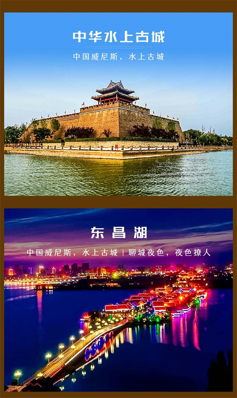 东昌湖与杭州西湖、南京玄武湖并称“全国三支市内名湖”,素有“南有西湖,北有东昌”之称,中华水上古城是一座飘在水上的千年古城,四周环水,大家可自由寻觅小吃、逛湖景、赏夜色,你也不防骑上脚踏车,来个环湖夜骑,更是一种享受。这里灯色夜秀异常美丽。