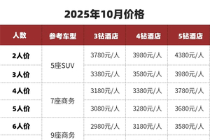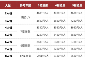 1、交通:5-12座全程专属用车及司机星级服务(全程司机兼向导,已含驾驶员食宿。驾驶员熟悉线路,会给队员提供行程建议,全程边走边玩,保证多次停车服务,但不会像专业导游一样解说,且不陪同队员进景区,请理解);