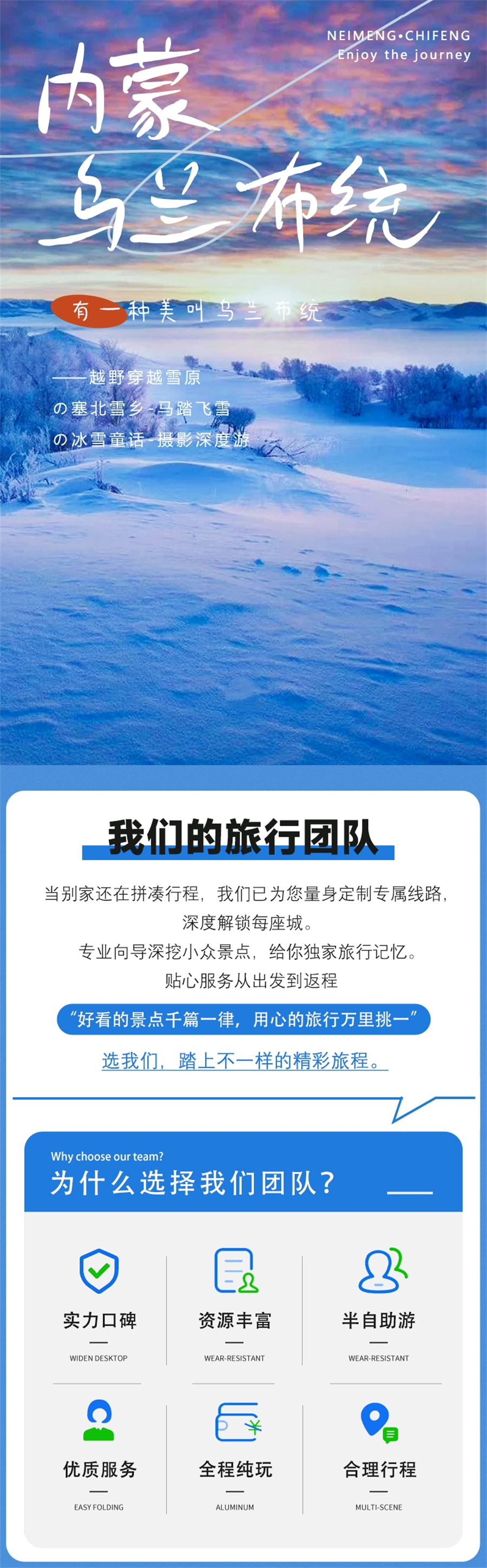请按集合信息准时集合出发,一路欢歌笑语开始旅程。下午我们到达乌兰布统,初到乌兰布统景区,绝美的雪域美景尽收眼底,让你终生难忘,哪里景色美我们就停留在哪里,雪地撒欢吧,别忘了留下你在雪野上的第一张照片,边走边拍行摄于无尽的内雪域高原。