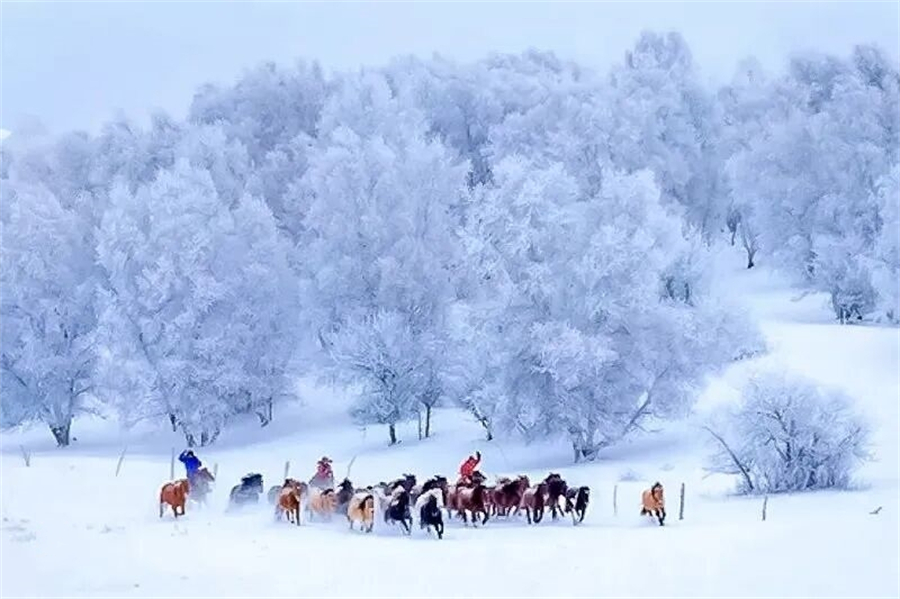 冬季,雪原莽莽,气象万千,诗意无尽!层林尽染的松树,潺潺流淌的小溪,袅袅升起的炊烟,恬淡宁静,雪极之姿从这里开始;雪地上奔跑骏马,让你在这个冰雪世界远离城市的喧闹,体会草原冬天的温度。