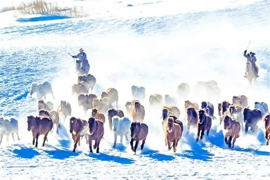 奔驰的骏马,驰骋在皑皑白雪的大草原,