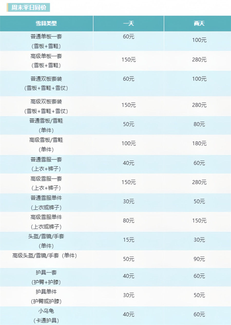 【费用不含】1)餐饮:本活动不含正餐,请自理或大家AA聚餐;2)其它:不含雪场租柜子费用及其它个人消费,不含教学,如需教练另咨询客服。3)雪板雪鞋等雪具不含,可代为租赁,雪具租赁团队价格(崇礼城区店内租用)