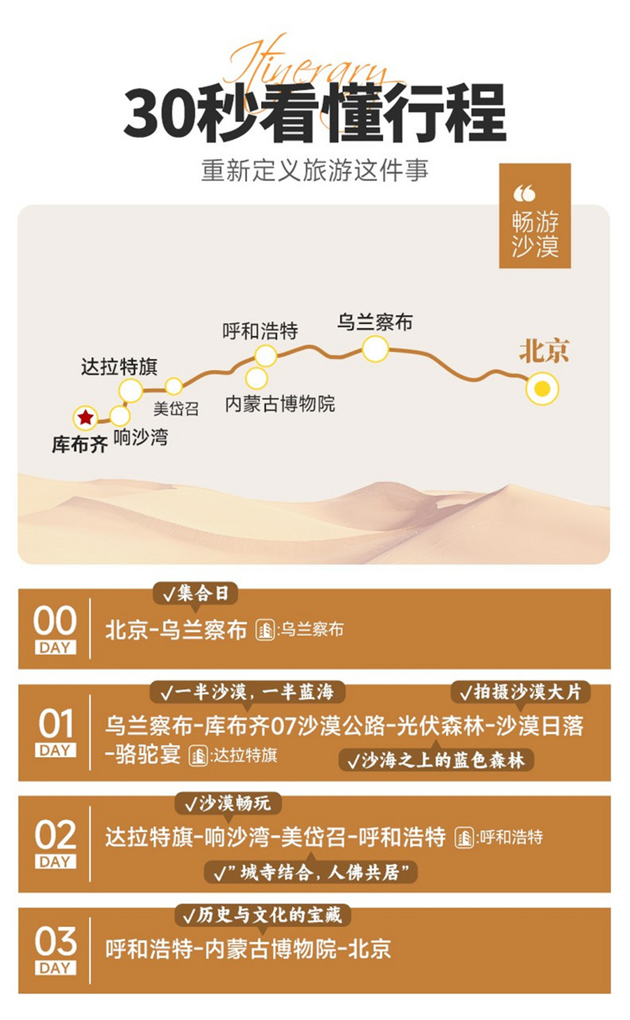 内蒙古 呼和浩特 【库布齐】07沙漠公路+越野车深度穿越+畅玩响沙湾+光伏森林+特色骆驼宴+内蒙古博物院+38人小团