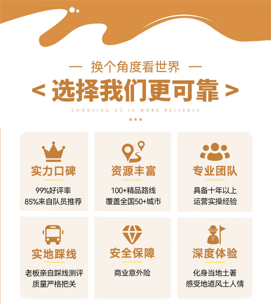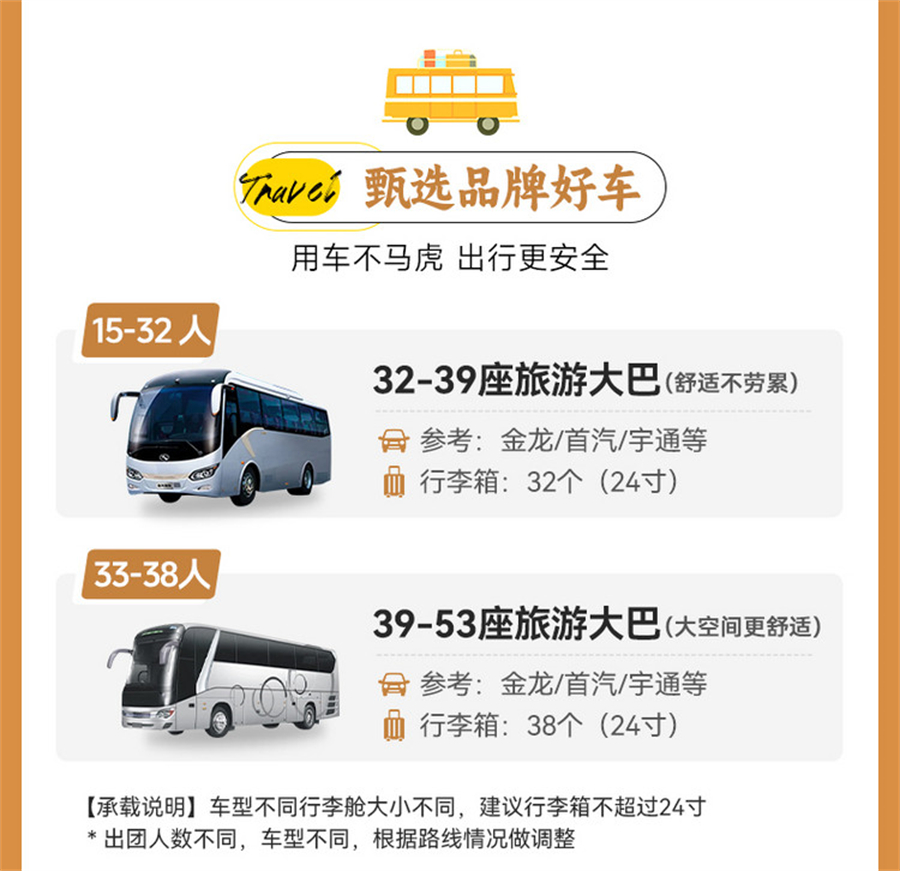 1、活动集合前1-2天会发送准确的集合时间、地点、车号、领队电话及温馨提示等相关信息,各位队友请留意查收并及时回复;2、以上行程时间及顺序供参考,受天气、交通、景区调控及队员体能等不同影响有可能会调整,以领队实际安排为准;