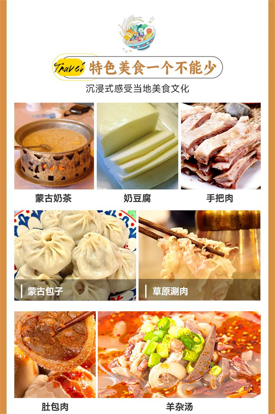·【美岱召】原名灵觉寺,后改寿灵寺,是内蒙古地区重要藏传佛教建筑之一,全国重点文物保护单位。美岱召依山傍水,在建筑上更有独特的风格,它是仿中原汉式,融合蒙藏风格而建,是一座“城寺结合,人佛共居”的喇嘛庙,四角筑有外伸约11米的墩台,上有角楼,寺周围筑有围墙,土筑石块包砌,平面呈长方形,周长681米,总面积约4000平方米。寺内有大量的壁画,如大雄宝殿内释迦牟尼历史壁画及描绘蒙古贵族拜佛的场面的壁画都完好无损,这些壁画生动逼真,有很高的艺术价值,是研究明代蒙古史、佛教史、建筑史、美术史的重要资料。参观结束我们前往内蒙古自治区的首府-呼和浩特(车程约1小时10分)酒店办理入住,洗去沙尘与疲惫,自由晚餐,呼市的烧麦、羊杂汤、冰煮羊、蒙餐、铁帽子烤肉,都是非常不错的~晚上自由活动,可以去【大召无量寺】和【塞上老街】游玩闲逛,体验塞外青城的烟火气息。