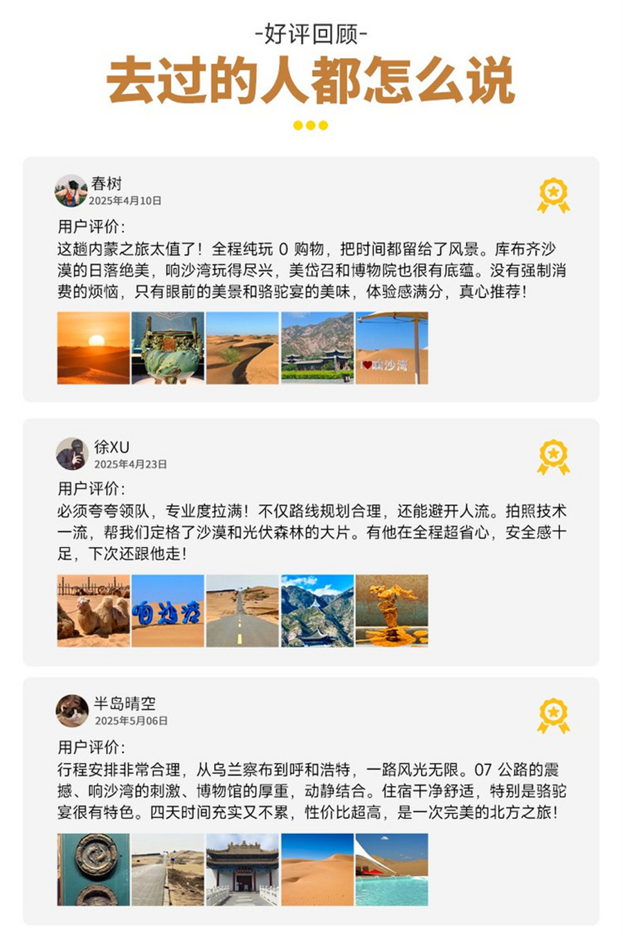 今天无需太早起,酒店享用早餐。08 :00左右,我们出发,前往库布齐沙漠(车程约3小时45分)中午到达沙漠边的小城-达拉特旗,在这里自由午餐,午餐后出发,前往库布齐沙漠。您可以选择乘坐巴士游玩,或者乘坐专业的沙漠越野车进入沙漠深处,体验越野冲沙的刺激,欣赏常人无法触及的美景。·【库布齐 07 沙漠公路】一条穿越中国第七大沙漠的黑色缎带,被誉为 "沙海天路"。原生态沙漠路线,以其金色沙丘与绿色治沙工程的完美融合,黑色柏油路如绸带蜿蜒于金色沙丘之间,起伏的地势使其从高处俯瞰形似阿拉伯数字 "7",这也是 "07" 名称的由来。不同于商业化景区,这里保留了沙漠原始野性,人少景美,可尽情感受 "大漠孤烟直,长河落日圆" 的雄浑。公路两侧的梭梭树与草方格固沙带,是中国 "以路治沙" 智慧的生动实践 —— 先以草方格锁住黄沙,再种上耐旱植物,形成绿色防护链。·【光伏森林】07沙漠公路起点是达拉特光伏领跑基地,这片 "蓝色海洋" 与金黄沙漠交相辉映,展现人类智慧与自然和谐共处的奇迹,登山观景台,可俯瞰整片光伏森林。日落时分,沙漠被余晖染成金色,登上沙丘之顶,等待一次沙漠日落吧。随后前往达拉特旗,今晚我们品尝当地特色的【骆驼宴】,这可真的是当地特色,在其他地方,很难吃到。骆驼都是专门饲养的,安全健康。你可能会被骆驼肉的巨大惊呆,肉质有些硬,但是也是很香。晚餐后,前往酒店入住休息。温馨提示:今日下午越野车和巴士走的路线不同,分开行动,越野车走的时候沙漠路线,巴士走的是公路。