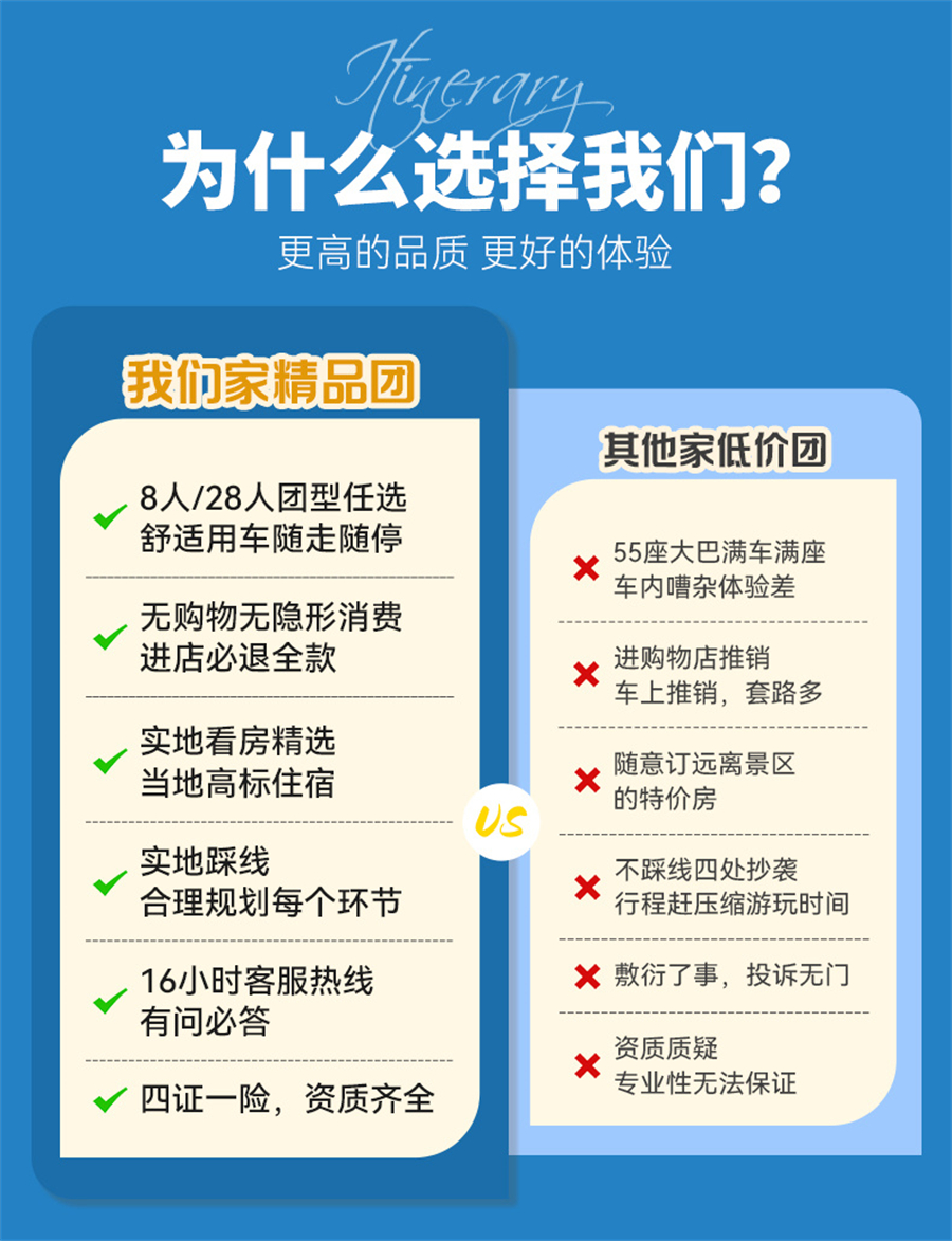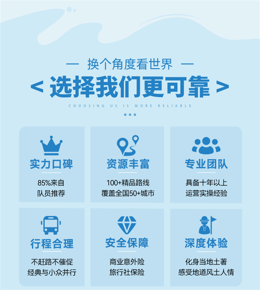 3、成团说明:如因参团人数未达到发团人数则取消当期活动,活动出行前提前通知并全额退款,积极为游客推荐类似路线或拼团。