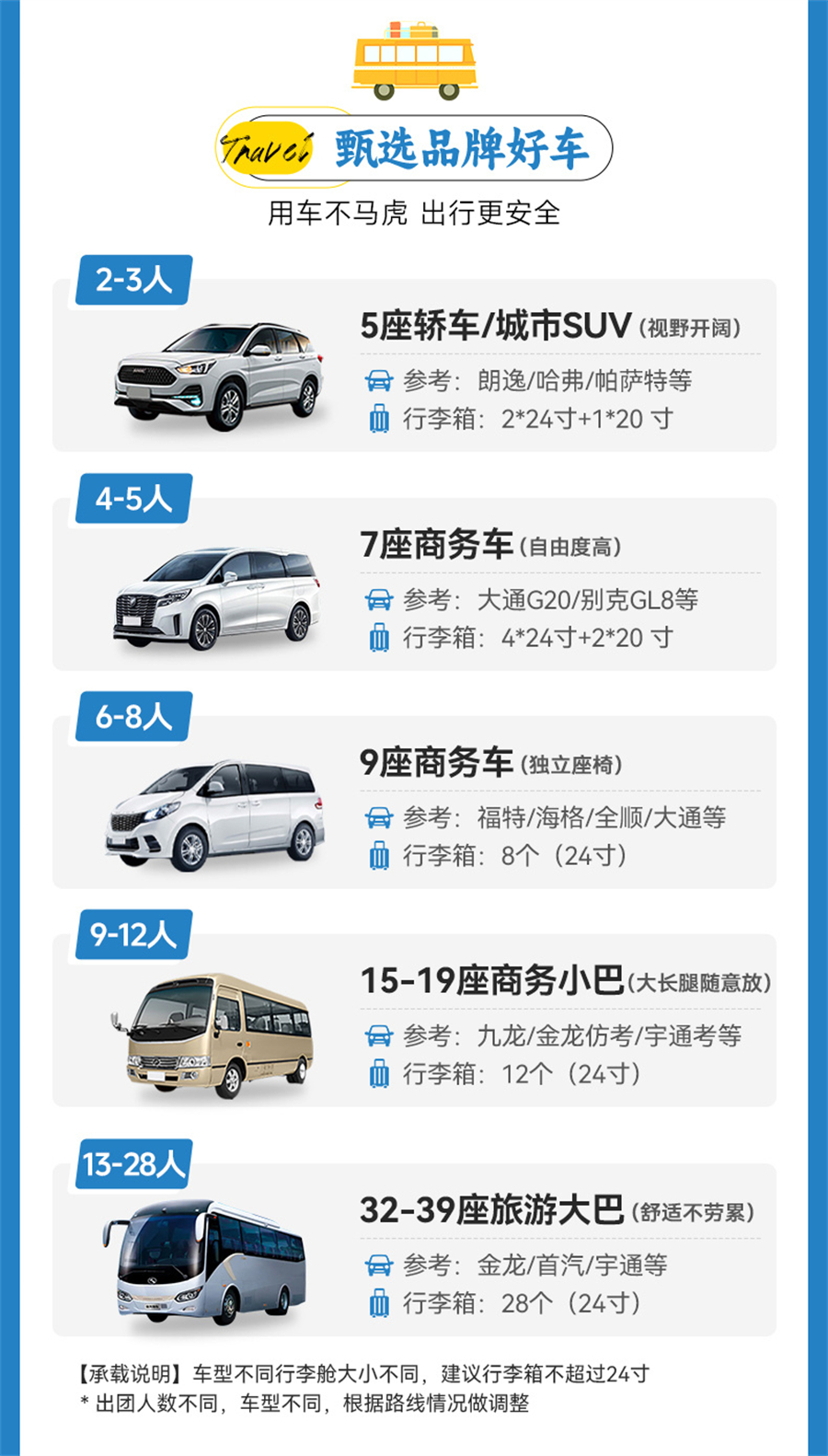 2、车上座位顺序为集合时先到的先坐,发车之后保持原车原座(有老年人、晕车等情况的领队将酌情调整);